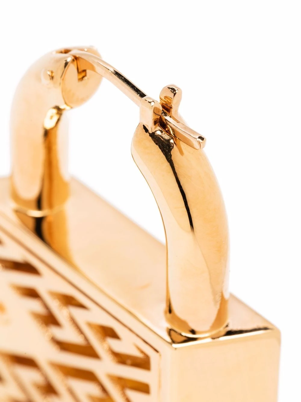 Détail Greca signature, logo gravé, détail de cadenas, fermoir épingle pivotant, pour oreilles percées. Matière : métal. Ces boucles d’oreilles sont vendues par paire.
