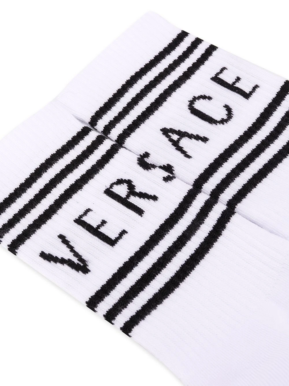 Chaussettes à logo en coton mélangé Versace avec tricot à nervures et longueur mi-mollet. Les chaussettes et la bonneterie doivent être retournés dans leur emballage d’origine.