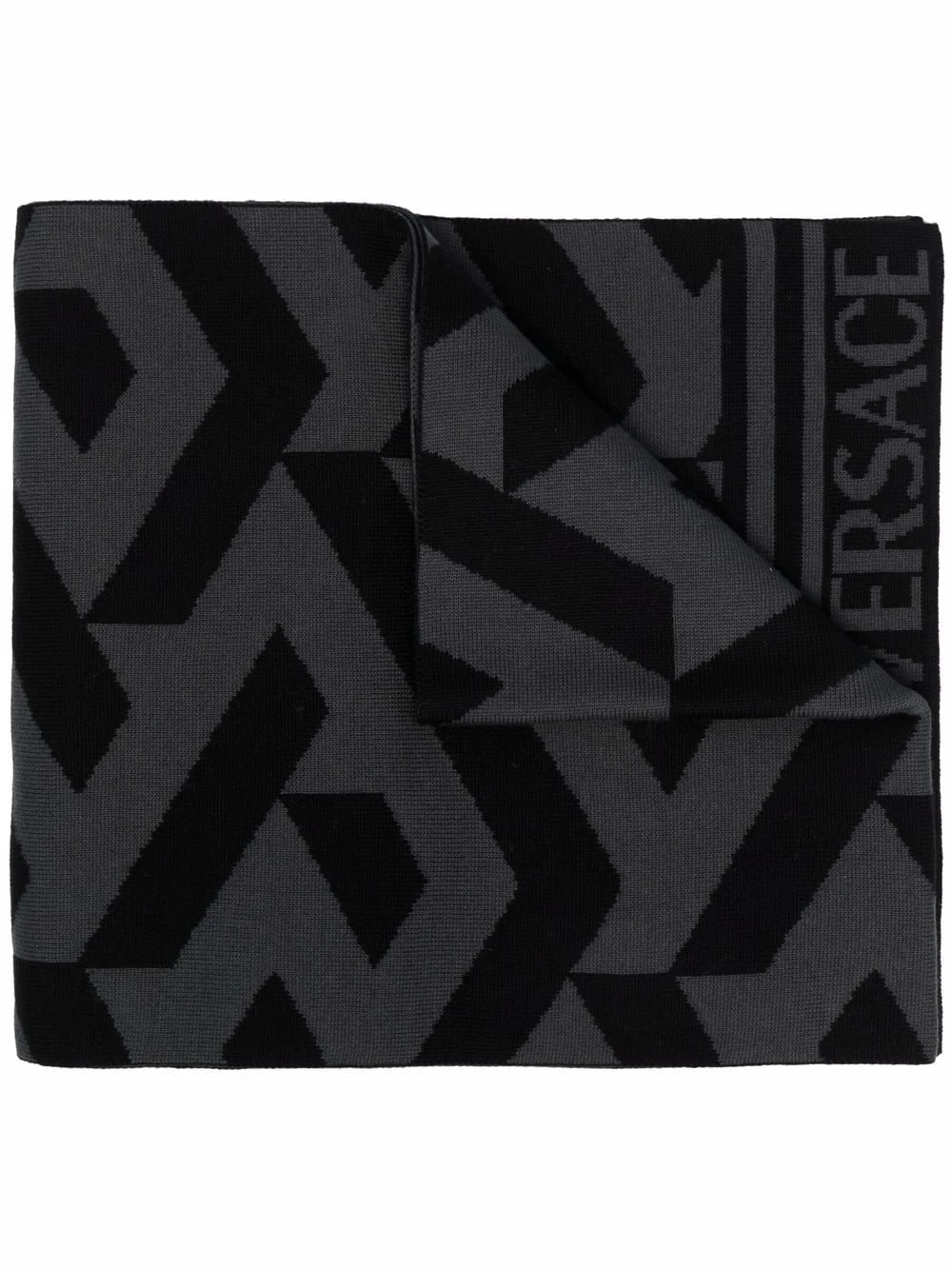 Design en maille, logo intarsia, détail Greca signature. Couleur : noir.