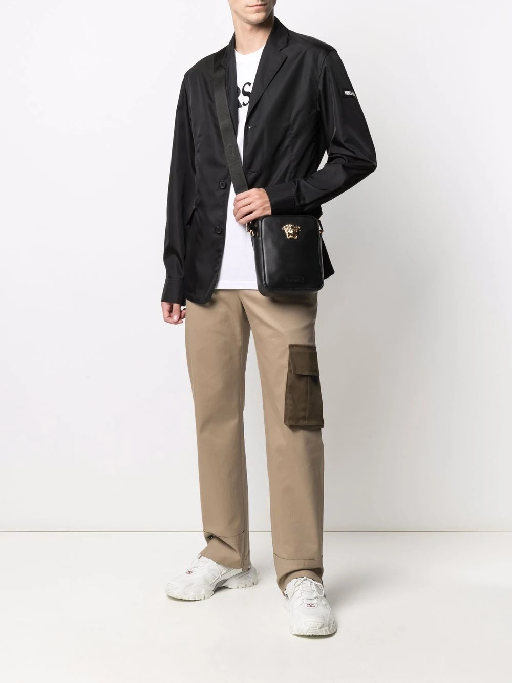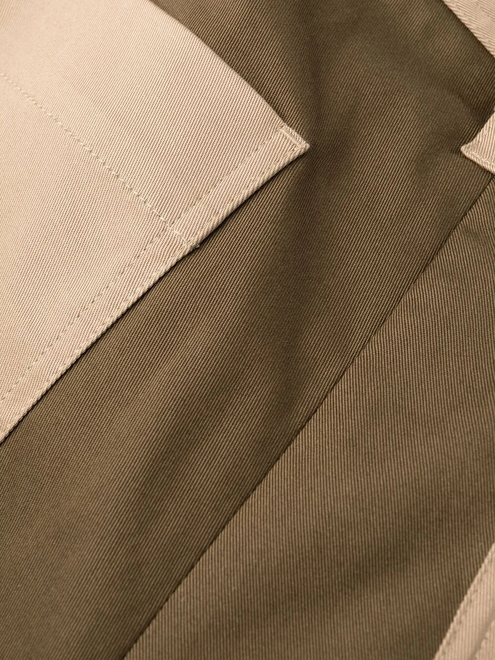 Boutonnière sur le devant, passants de ceinture, poche devant à rabat, poches arrière plaquées, coupe droite.