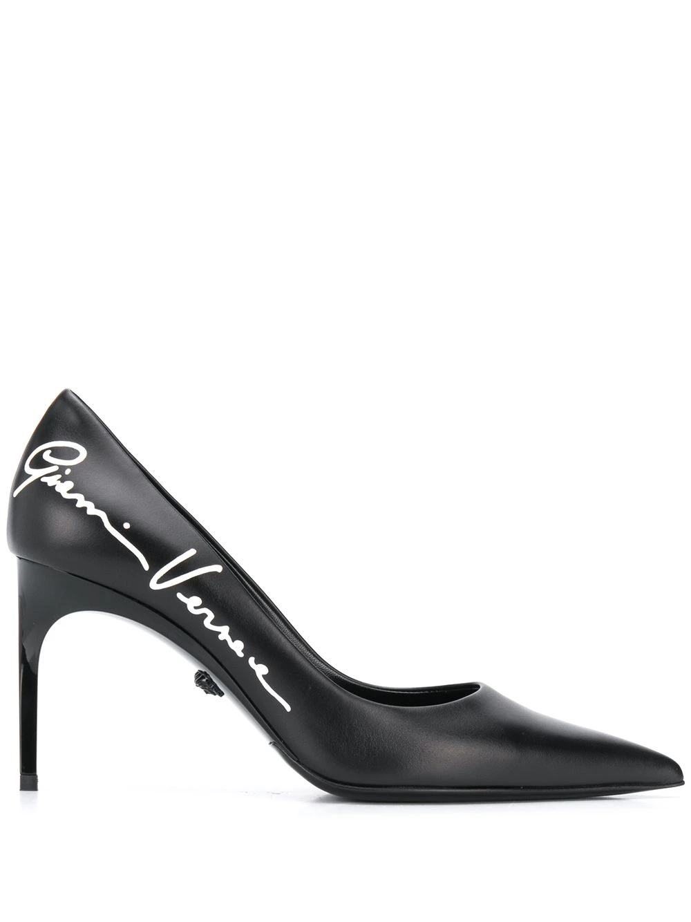Bout pointu, doublure en cuir, talon aiguille, logo imprimé sur le côté. Couleur : noir. Matière : cuir.