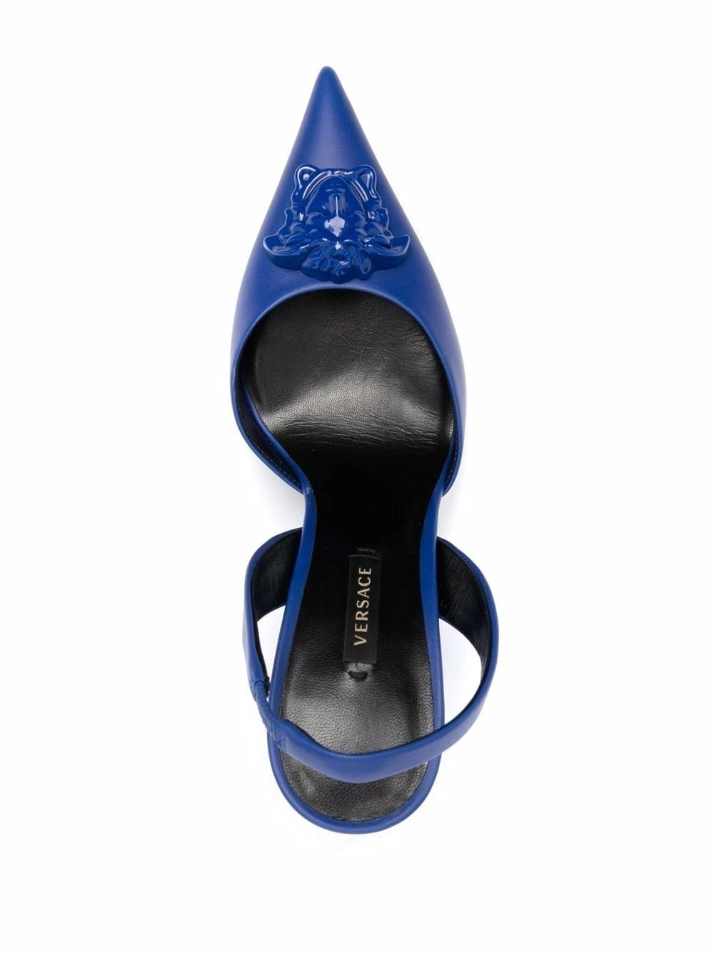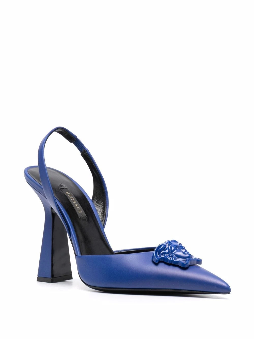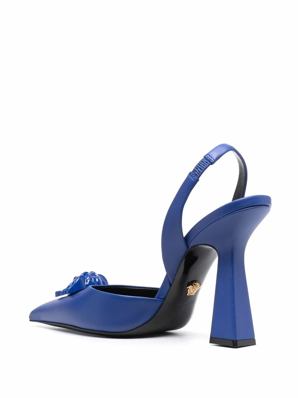 Motif Medusa, design ton sur ton, bout pointu, bride arrière élastique, semelle intérieure griffée, talon sculpté haut, semelle en cuir. Couleur : bleu. Matière : cuir de veau.