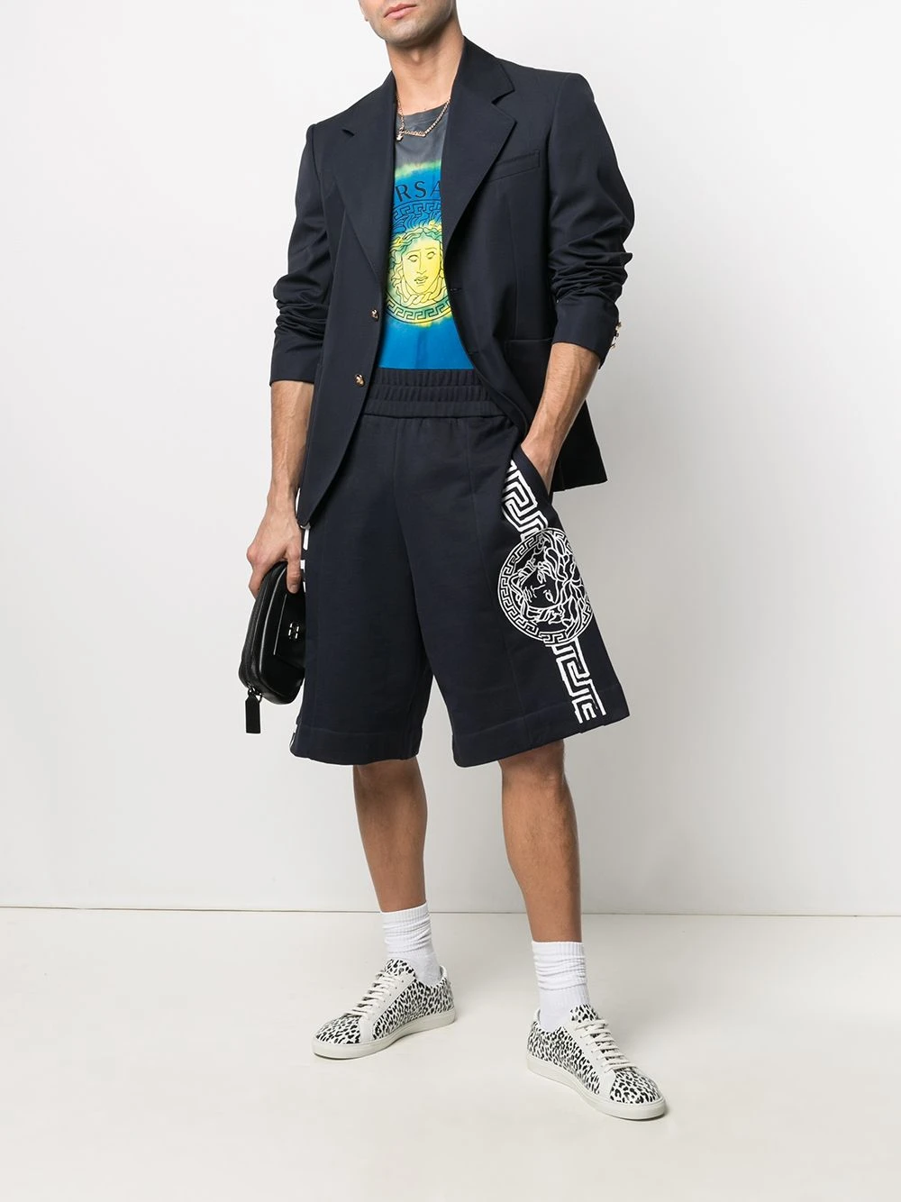 Logo imprimé sur le côté, motif Medusa, motif imprimé, ceinture élastique, deux poches latérales passepoilées, hauteur genou. Matière : coton.