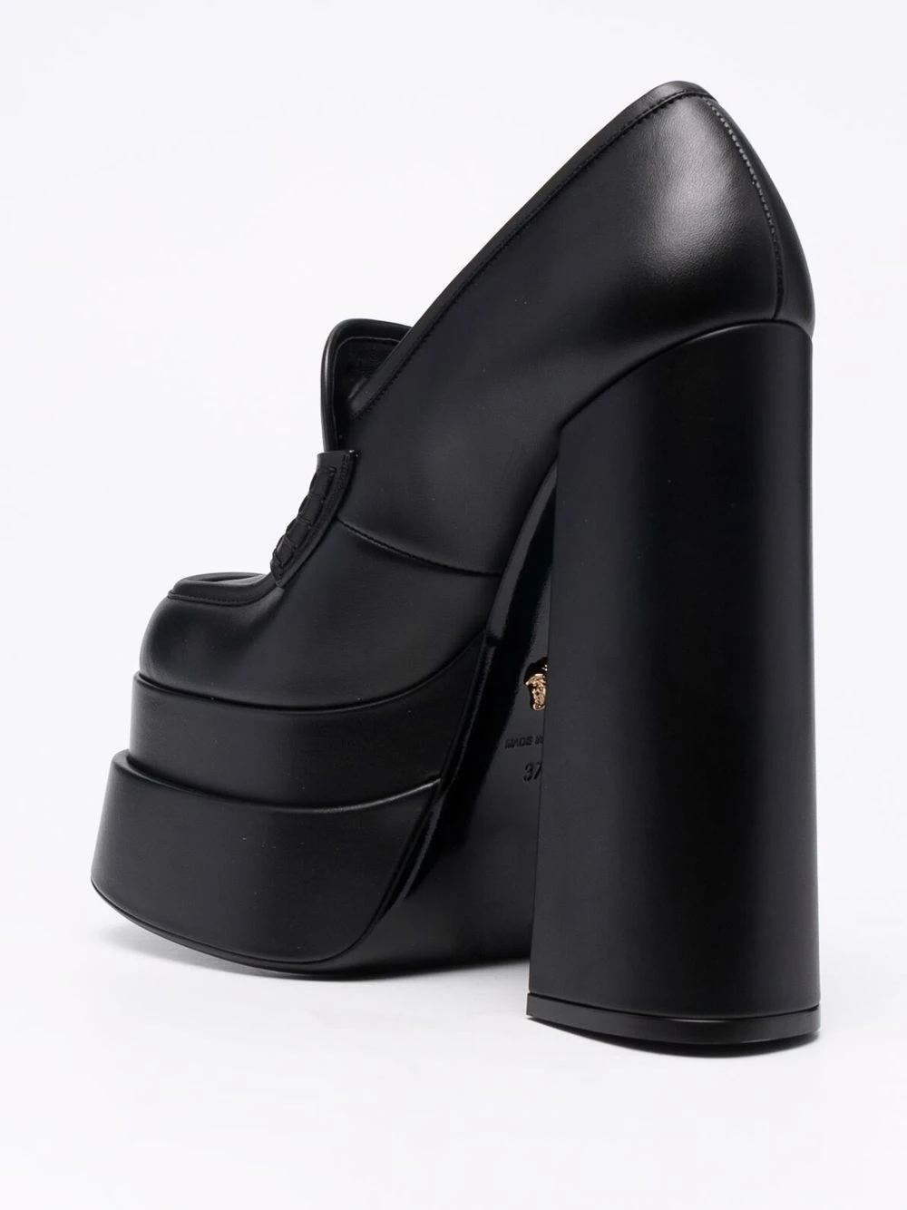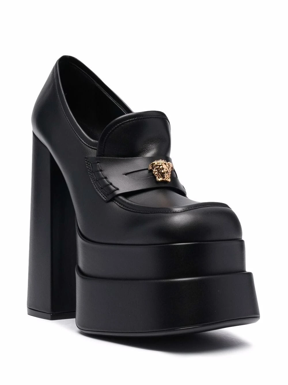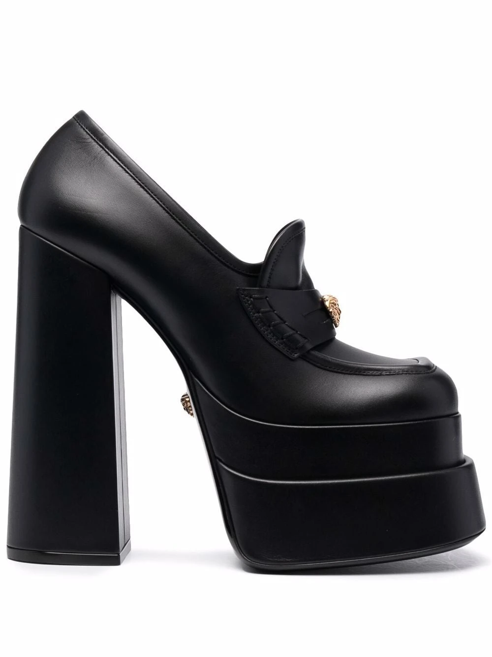 Bout carré, détail Medusa, semelle intérieure à logo, design à enfiler, talon haut épais. Couleur : noir. Matière : cuir.