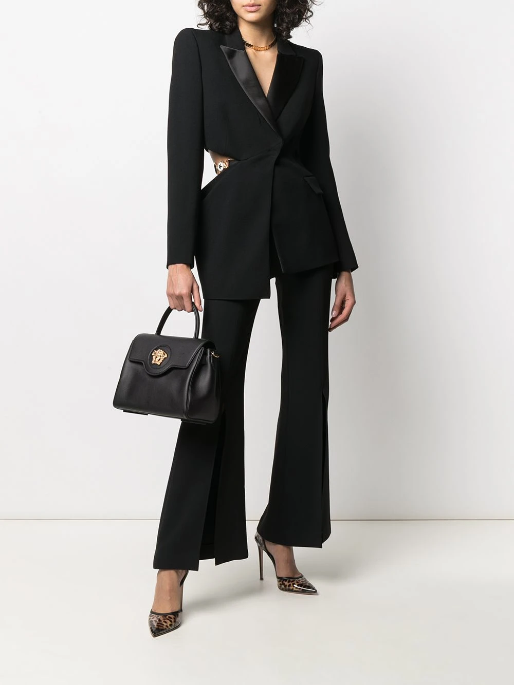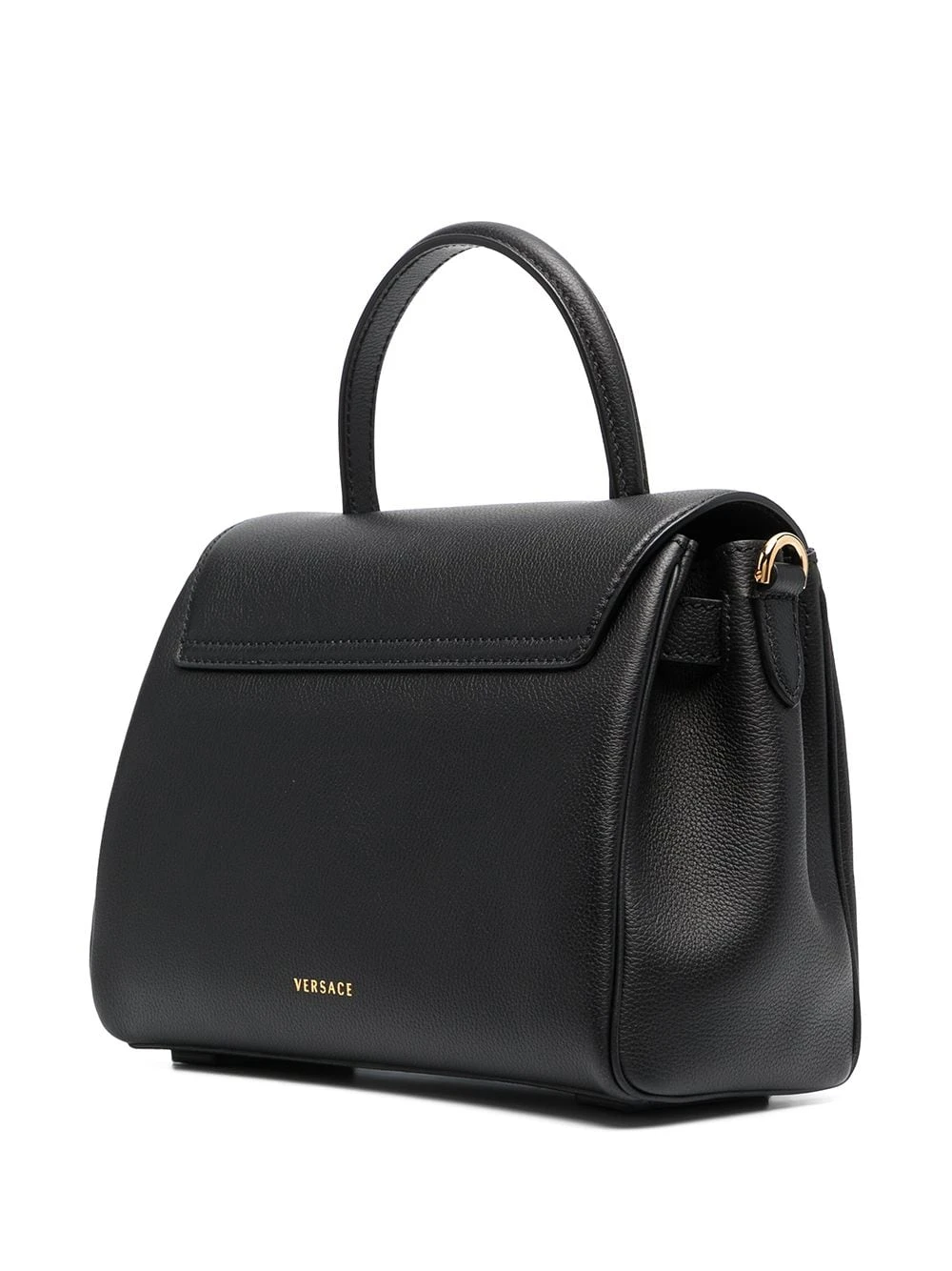 Anse arrondie, rabat sur le dessus, motif Medusa, poche intérieure plaquée, finitions en métal doré. Couleur : Noir. Matière : cuir.