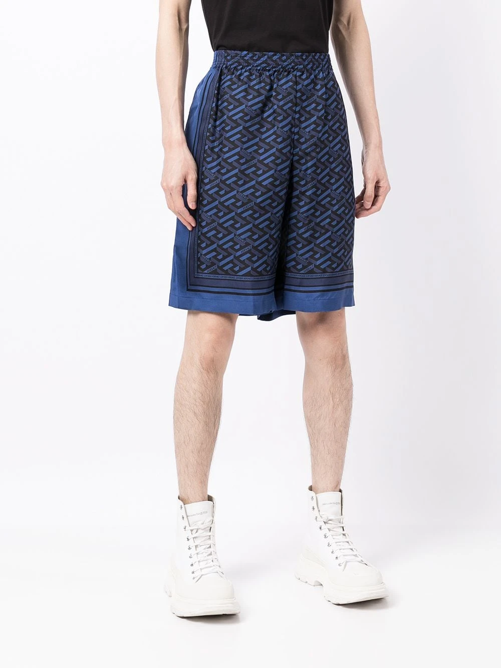 Bleu marine, soie, motif Greca signature imprimé, ceinture élastique, à enfiler, deux poches latérales fendues.
