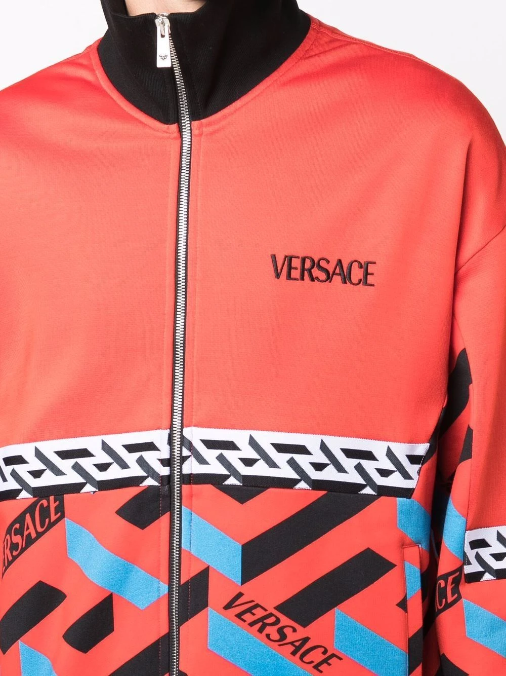 Logo imprimé à la poitrine, imprimé La Greca signature, col cheminée, fermeture zippée devant, manches longues, bordures nervurées.