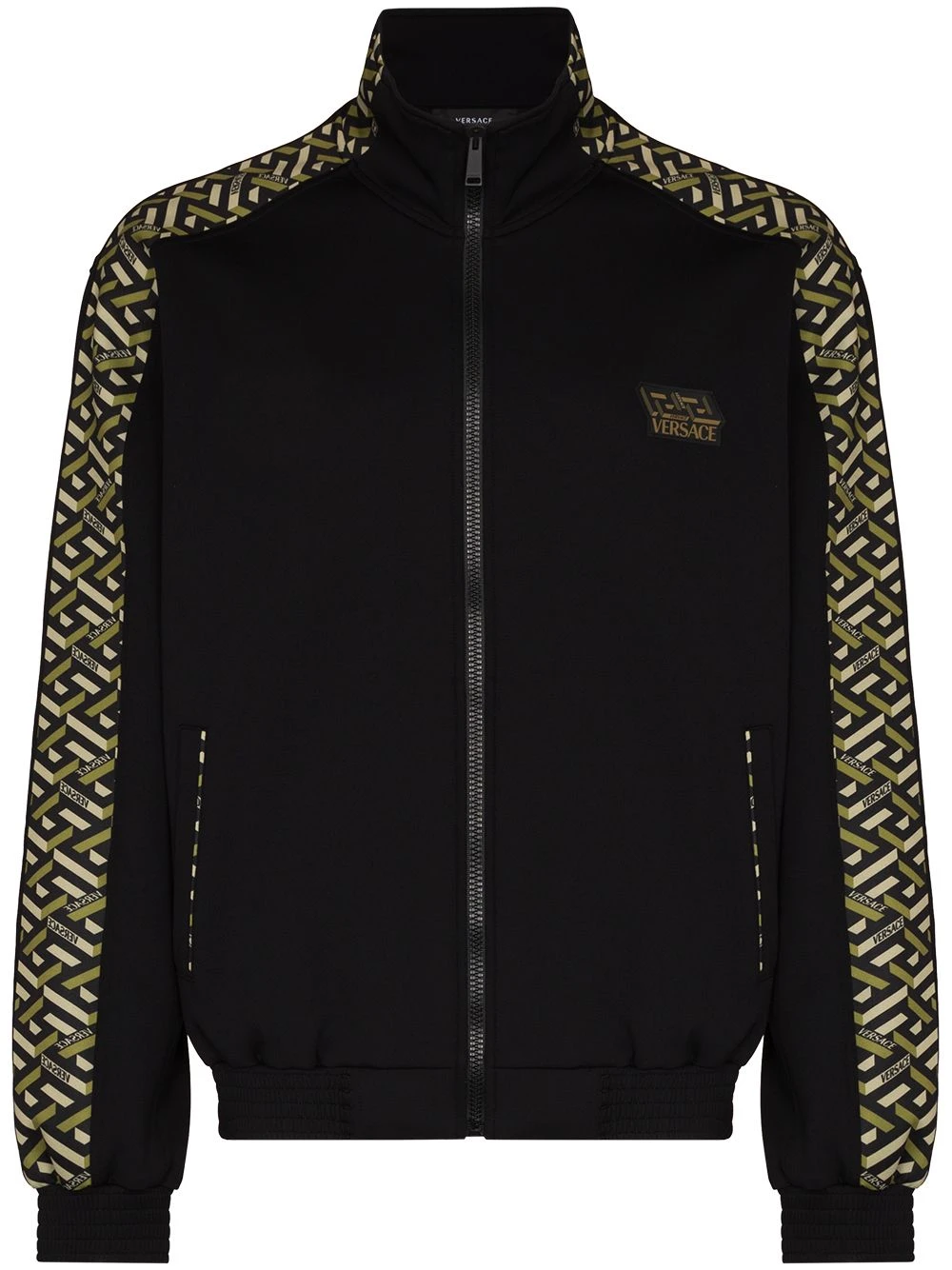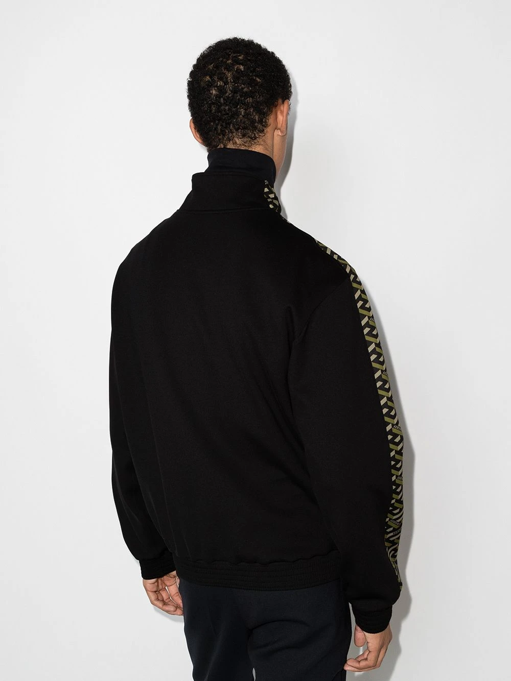 Motif Greca signature imprimé, patch poitrine à logo, col montant, fermeture zippée devant, manches longues. Couleur : noir.