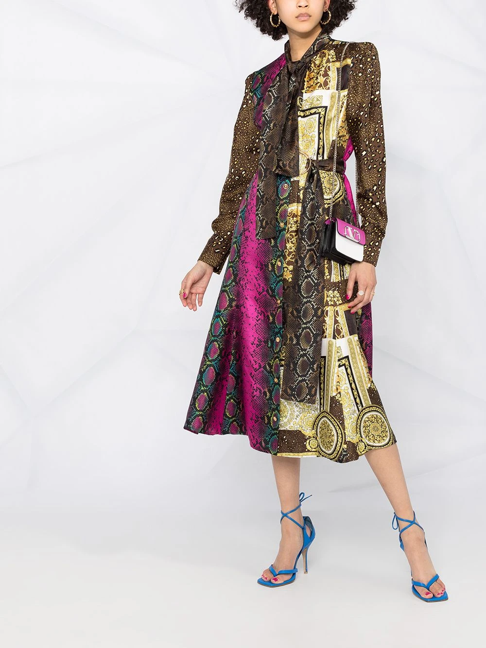 Design colour block, col lavallière à nouer, boutonnière sur le devant, taille ceinturée, deux poches latérales passepoilées, manches longues, poignets boutonnés. Matière : soie.