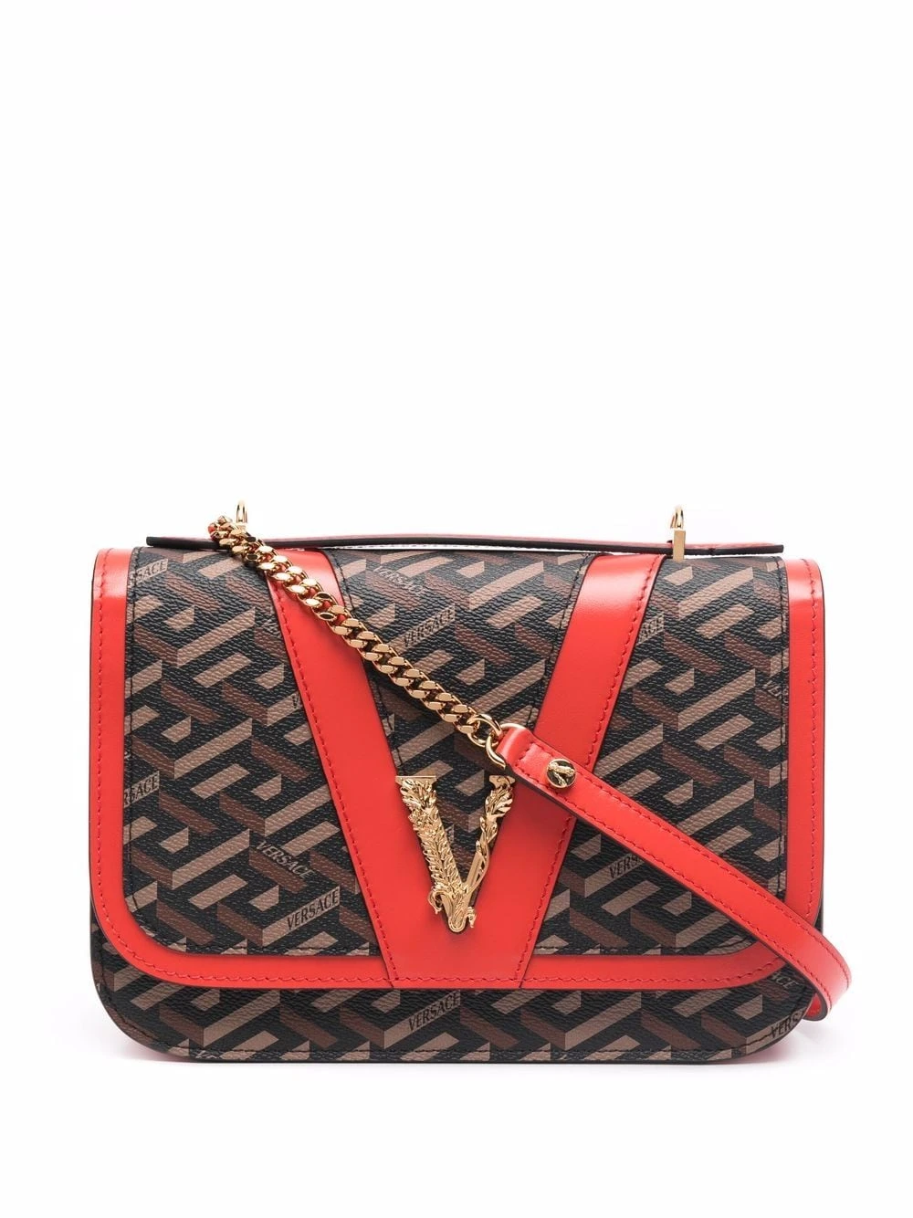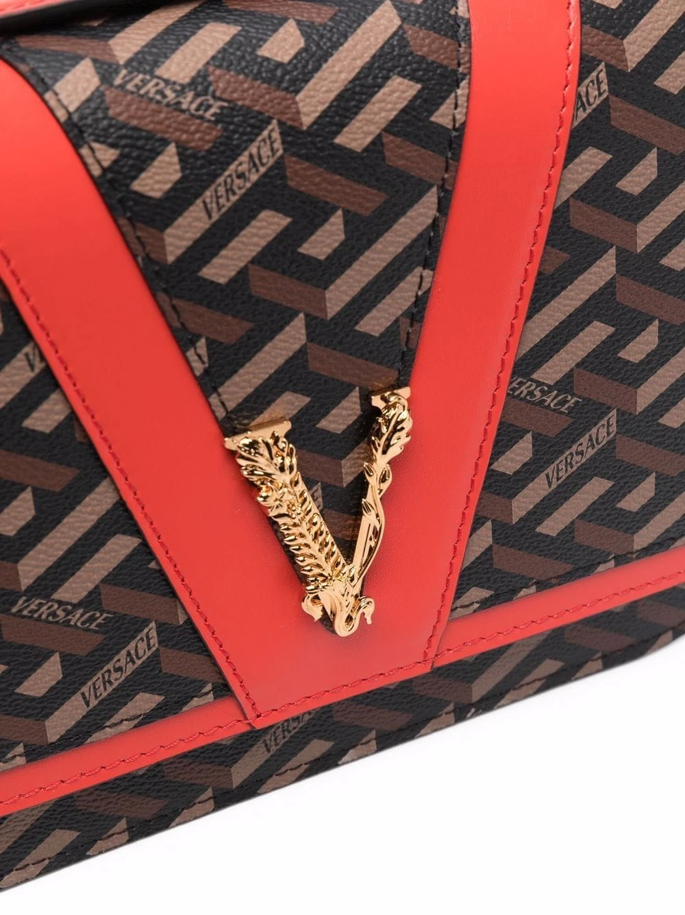 Détail de logo Virtus signature, design à empiècements, motif Greca signature imprimé, plaque logo dorée, compartiment principal, poche intérieure zippée, rabat sur le dessus à fermeture magnétique, anse classique, bride porté épaule en chaîne détachable.