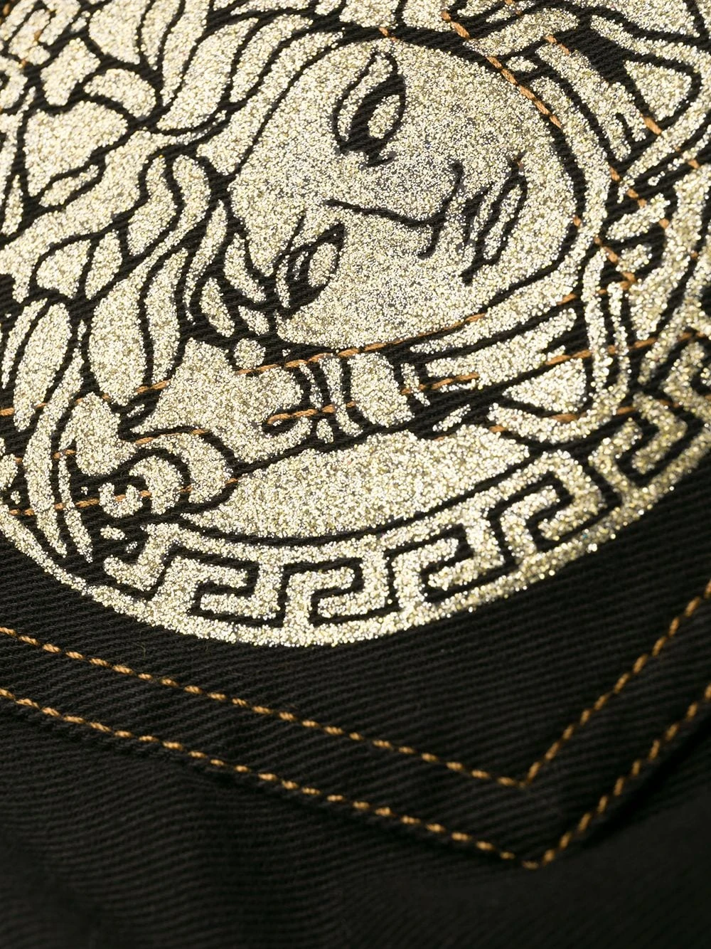 Jean skinny à motif Medusa Versace avec bouton et zip, détail Medusa, coupe skinny, coupe classique cinq poches, taille normale, étiquette en cuir à l’arrière et logo brodé à l’arrière. Couleur : noir.