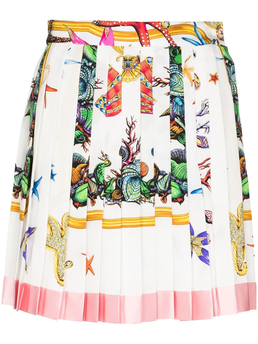 Taille haute, design plissé, coupe courte, fente latérale, imprimé étoile de mer. Matière : soie.
