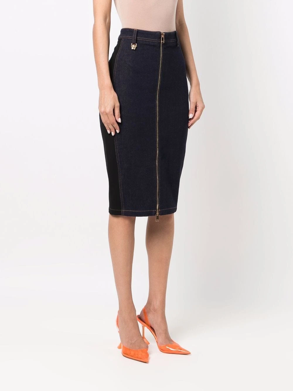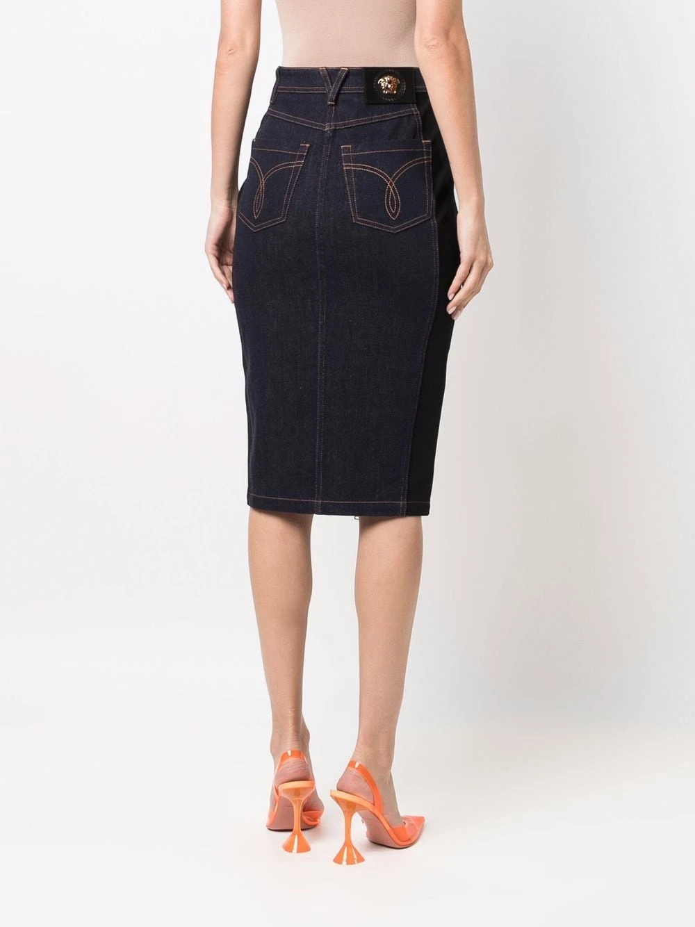 Finitions en métal doré, motif Medusa, taille haute, poches arrière plaquées, fermeture zippée devant, coupe mi-longue. Couleur : bleu.