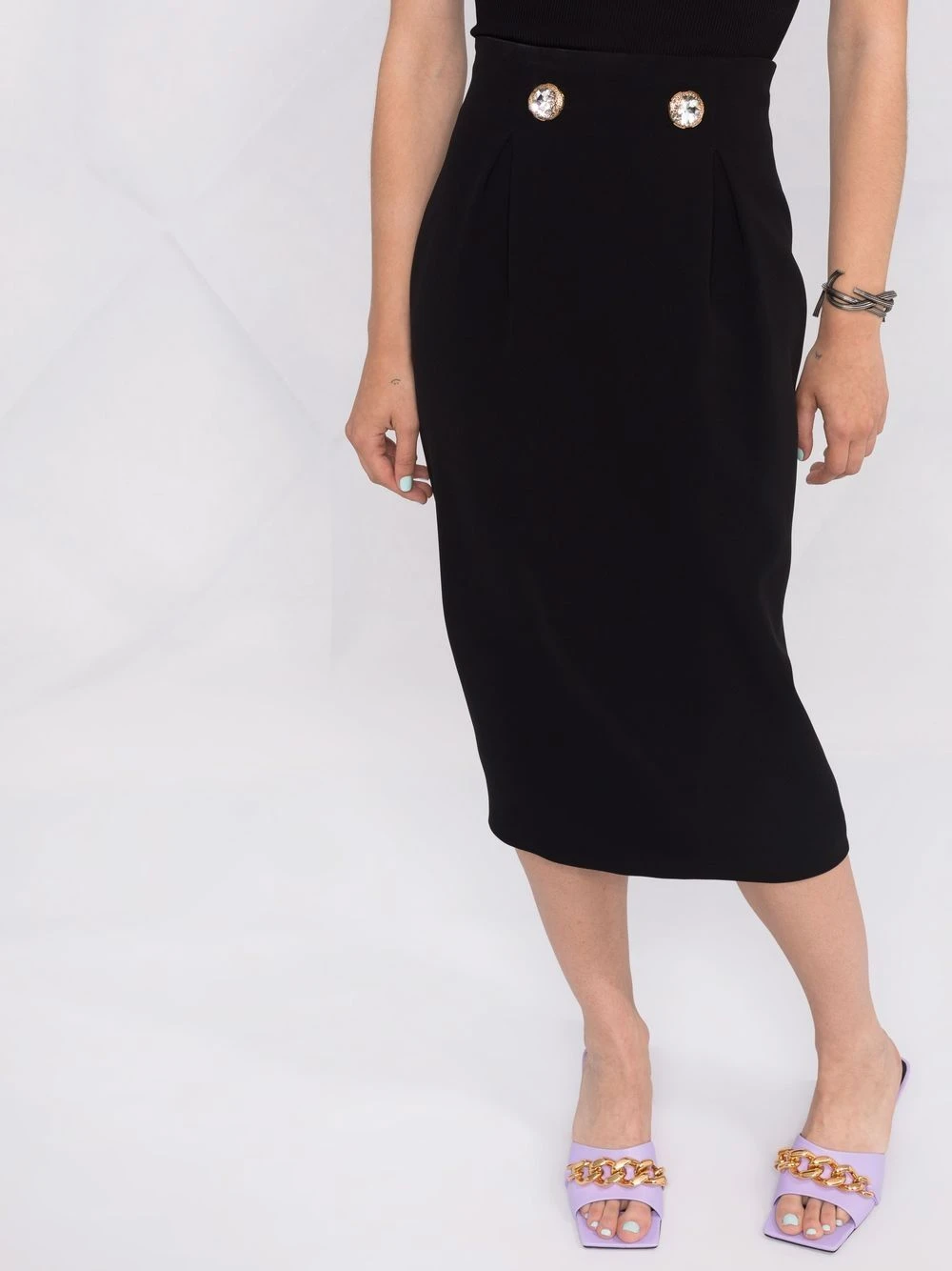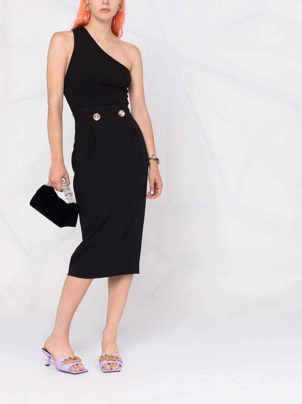 Taille haute, ornement en cristal, détail Greca signature, finitions en métal doré, fermeture zippée dissimulée à l’arrière, coupe mi-longue. Couleur : noir. Matière : soie.