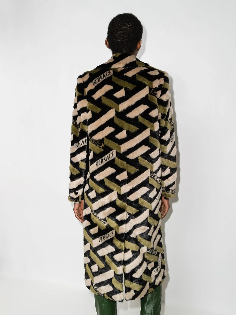 Motif Greca signature imprimé, larges revers crantés, boutonnière sur le devant, manches longues, deux poches passepoilées latérales, coupe mi-longue.