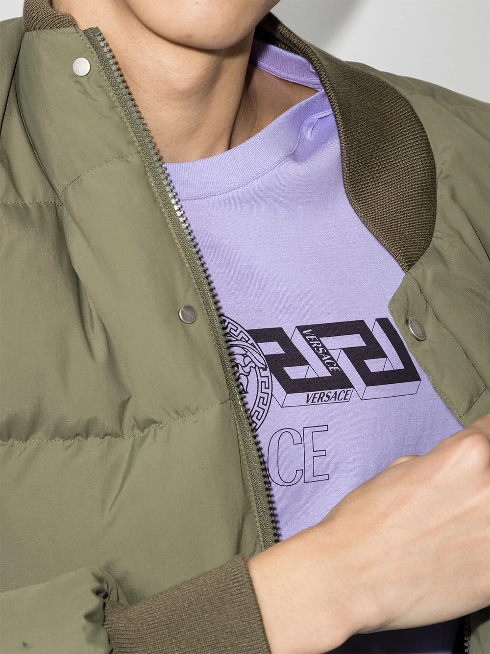 Lilac cotton Medusa Head logo-print T-shirt from VERSACE featuring Medusa Head motif, signature La Greca print, round neck, short sleeves and straight hem.