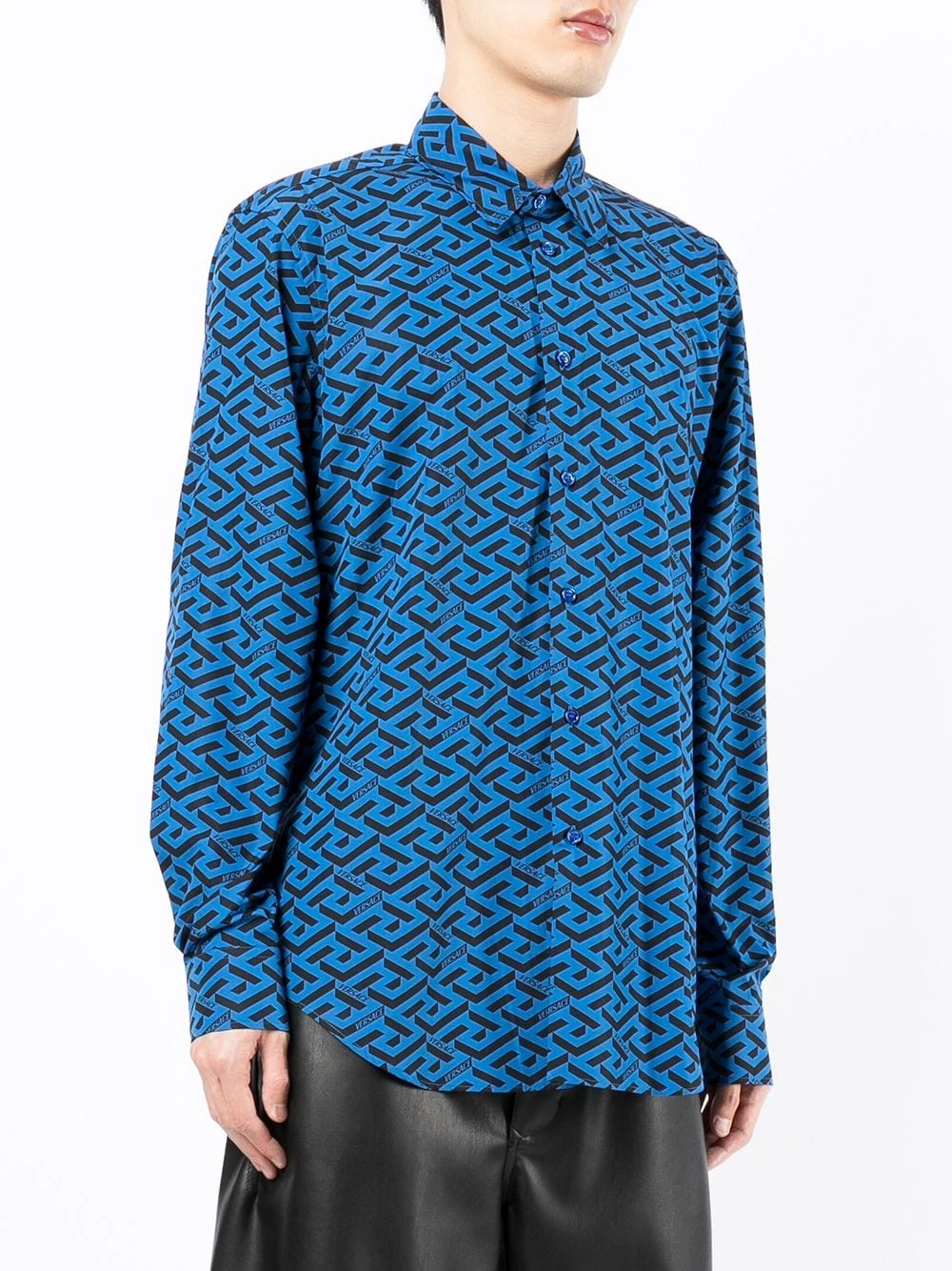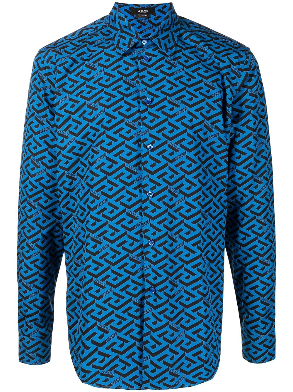 Imprimé monogrammé, col boutonné, manches longues. Couleur : bleu. Matière : coton.