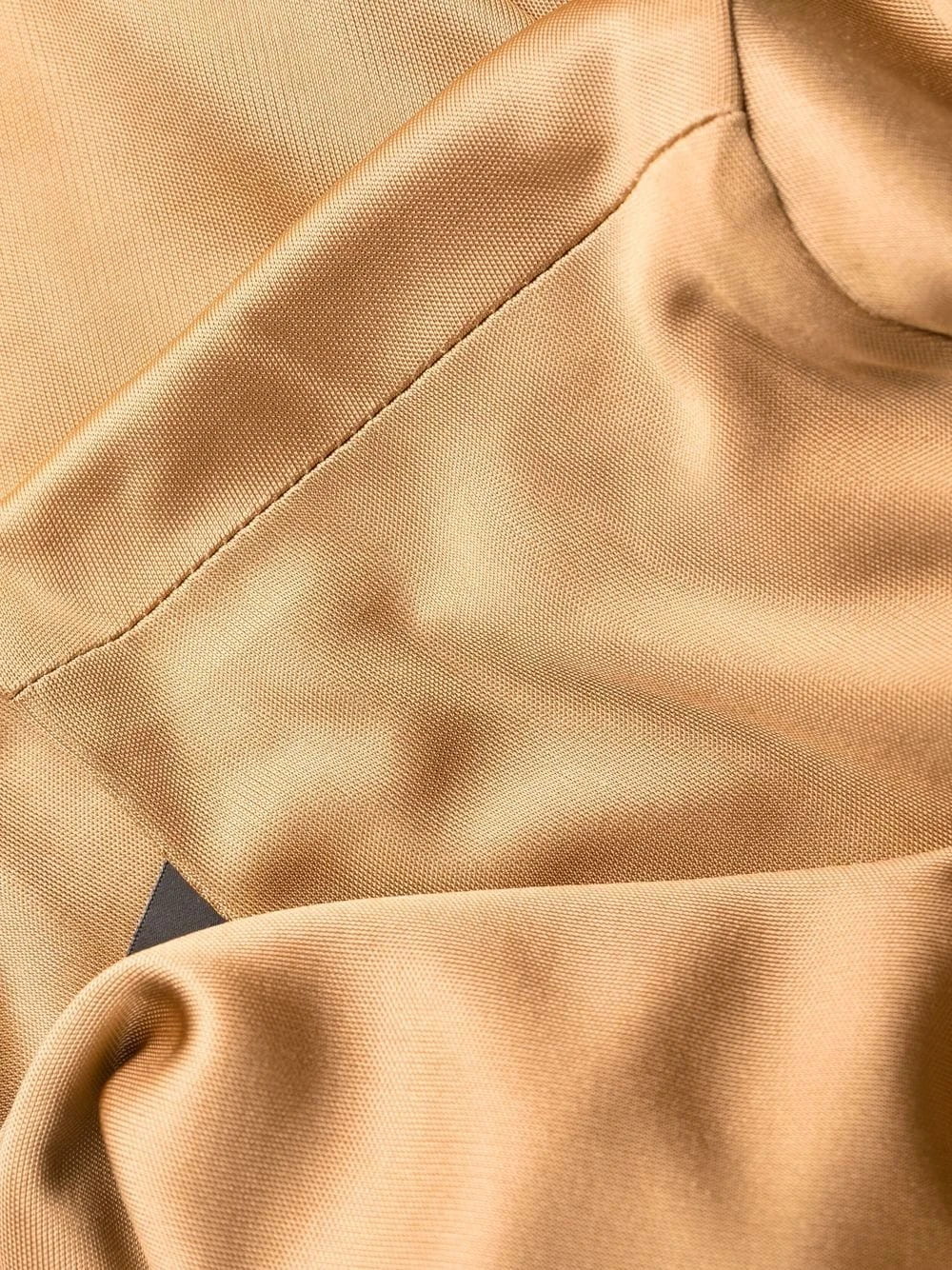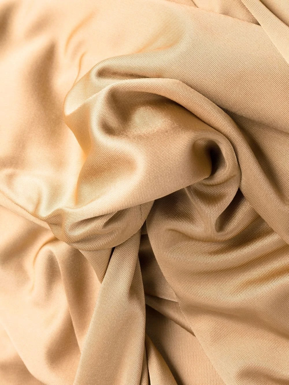 Fini satiné, détail drapé, détails de fronces, encolure ronde, manches longues.