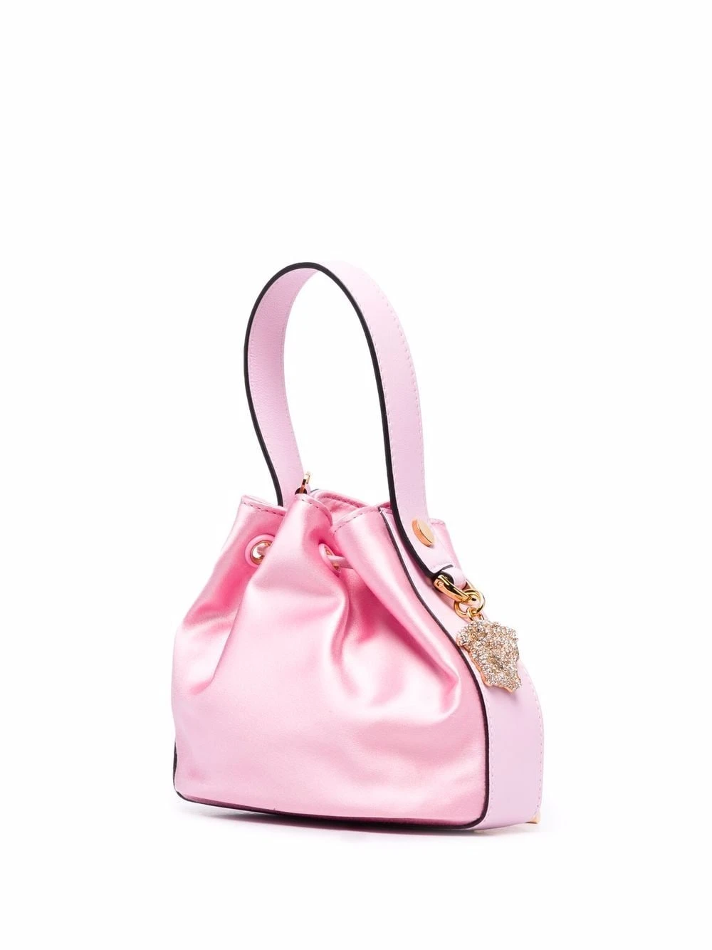 Fini satiné, détail Medusa, ornement en cristal, finitions en métal doré, anse classique, bride porté épaule en chaîne détachable, fermeture à lien de resserrage, compartiment principal. Matière : cuir.