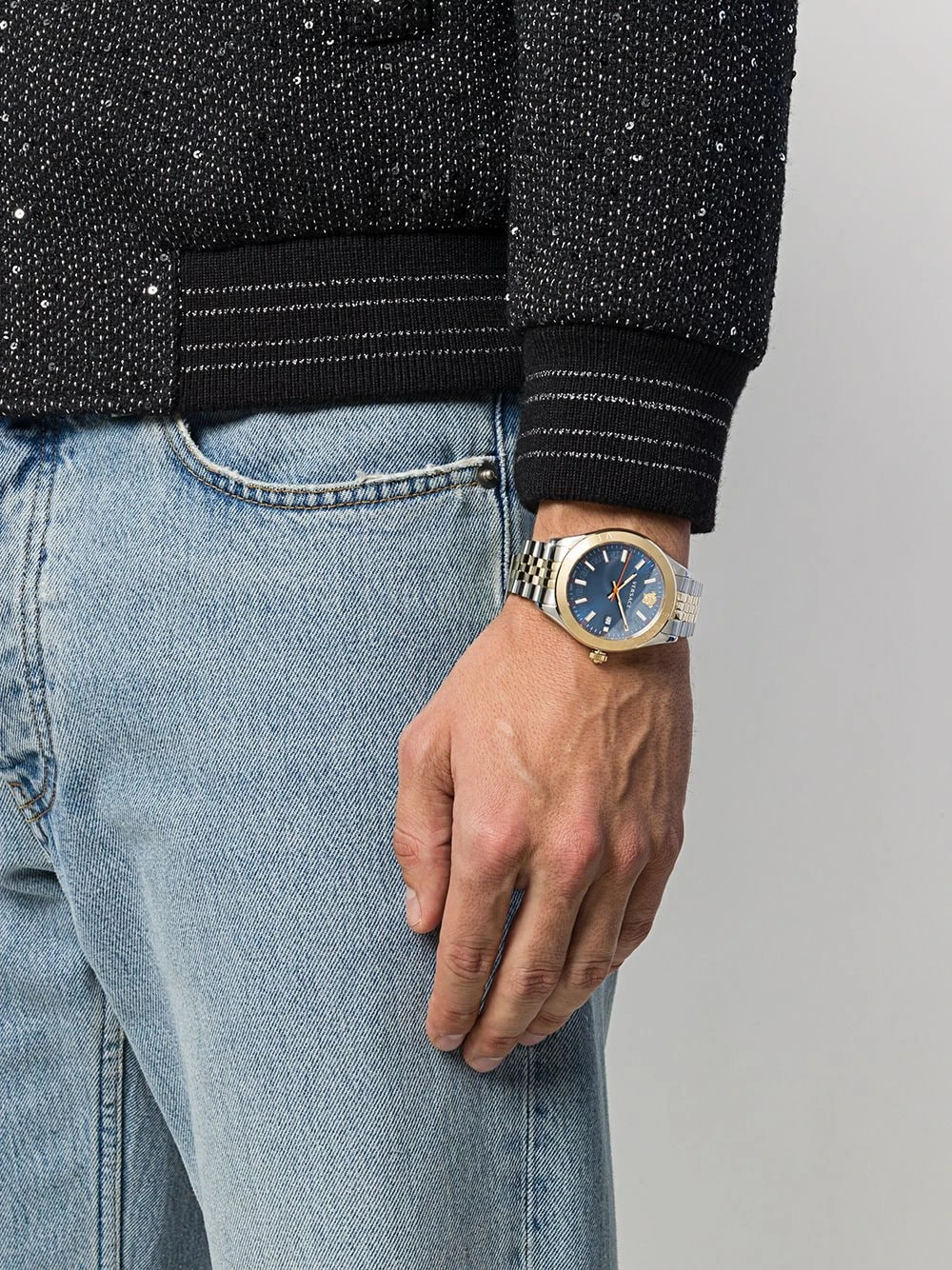 Boîtier rond, mouvement à quartz, bracelet à maillons ajustable. Matière : acier inoxydable.