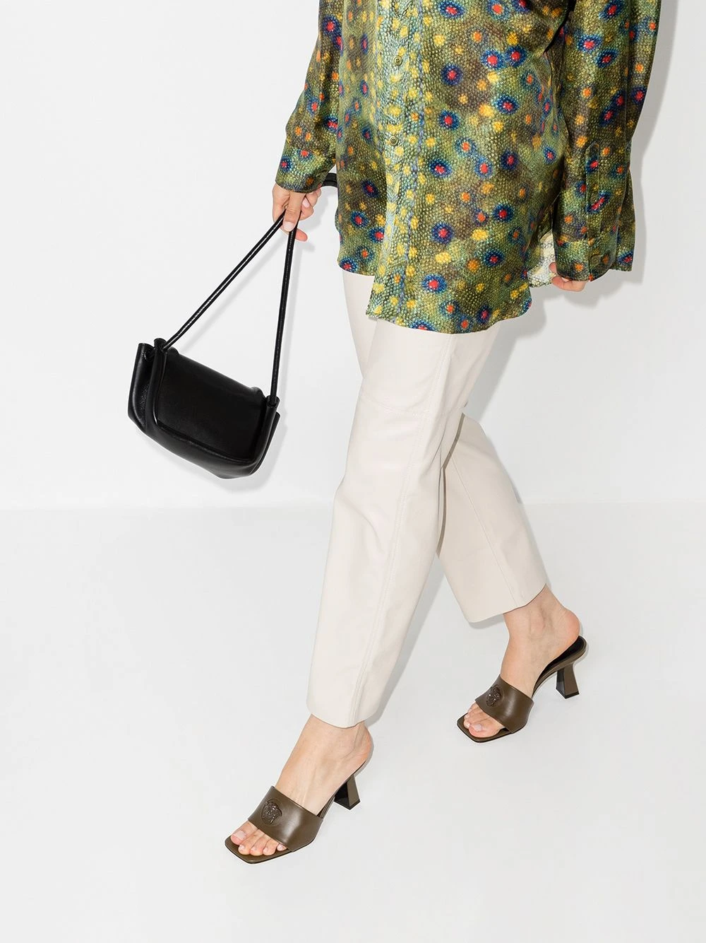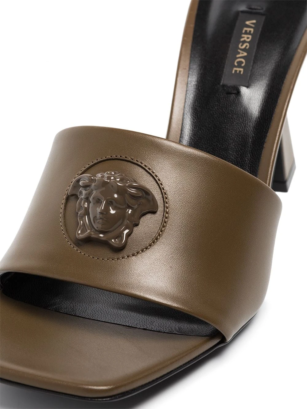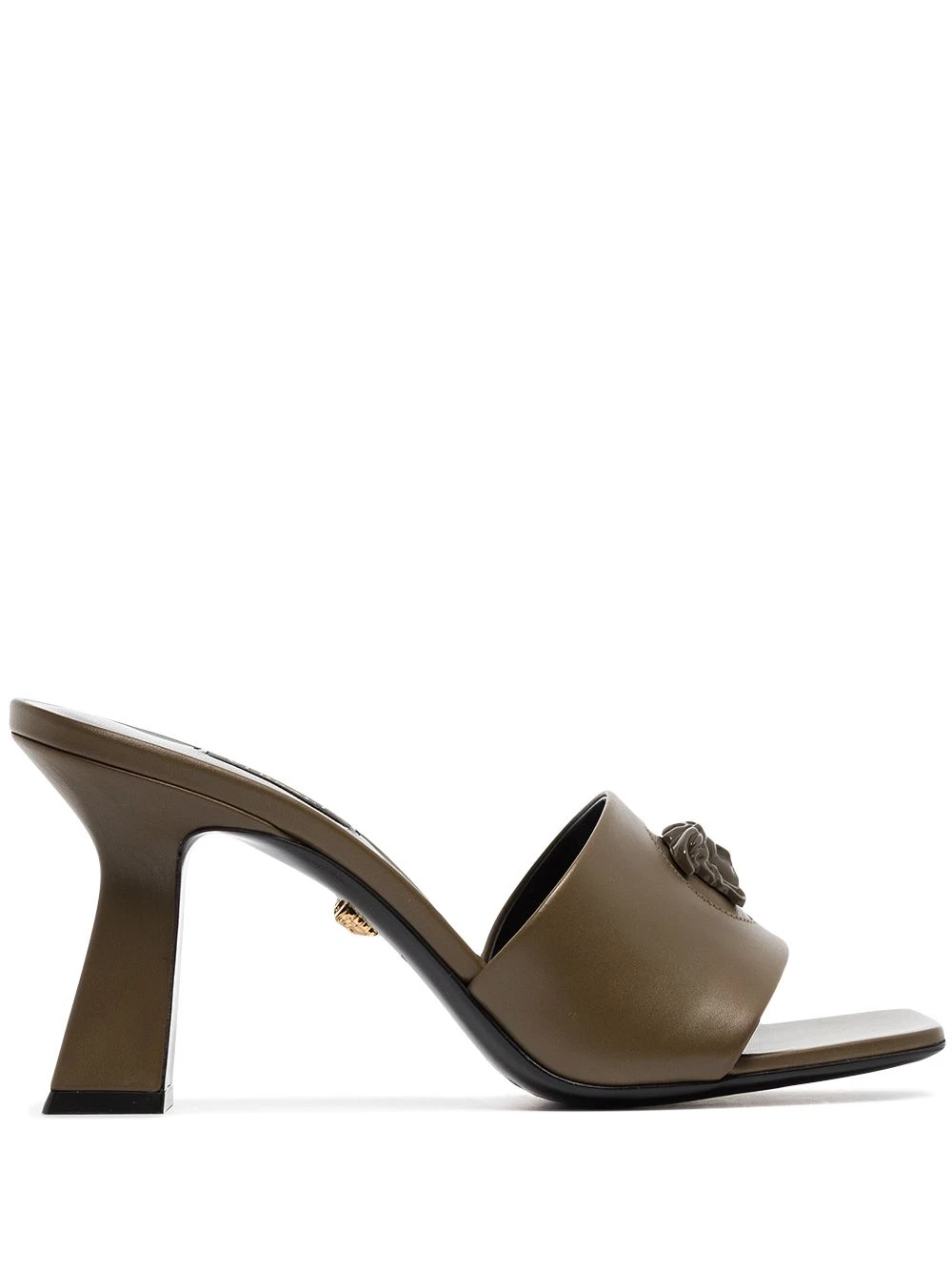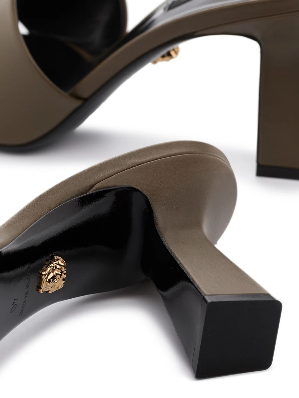 Motif Medusa, bout ouvert, semelle intérieure griffée, bout ouvert, talon mi-haut sculpté. Matière : cuir de veau.