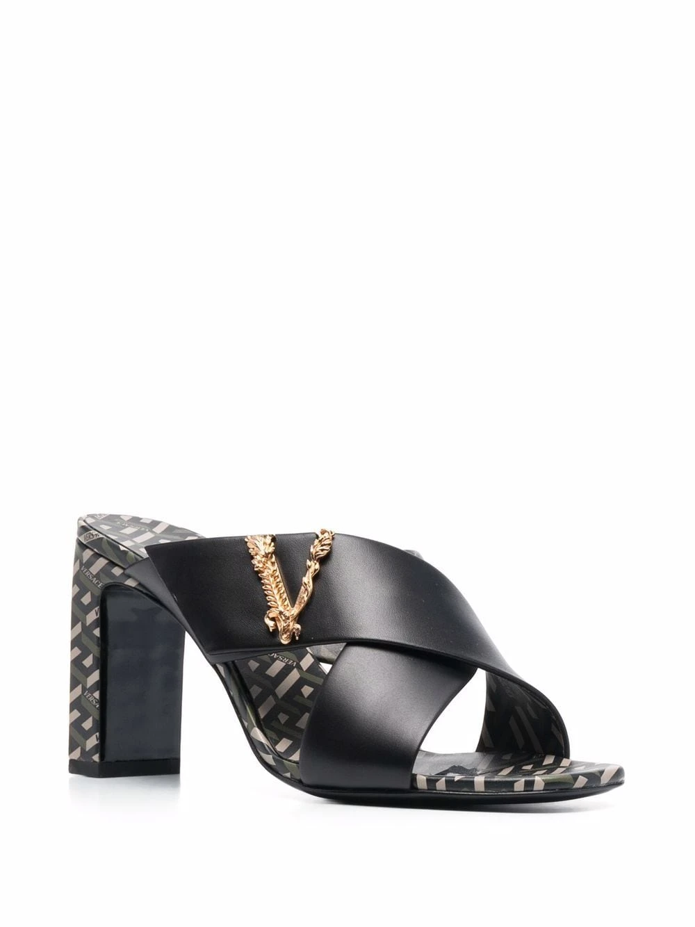 Bout ouvert, plaque logo dorée, brides croisées aux orteils, semelle intérieure à logo, design à enfiler, talon haut. Couleur : noir. Matière : cuir.