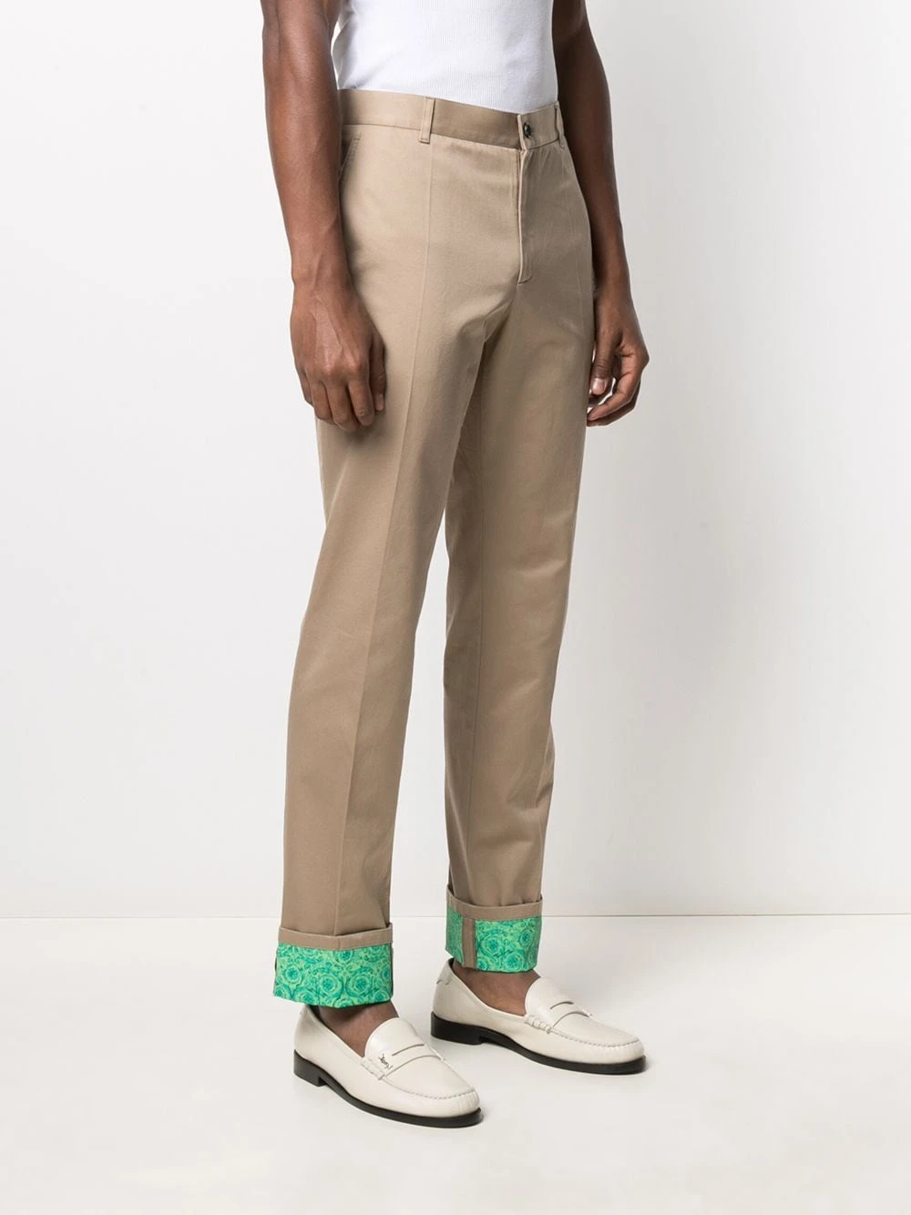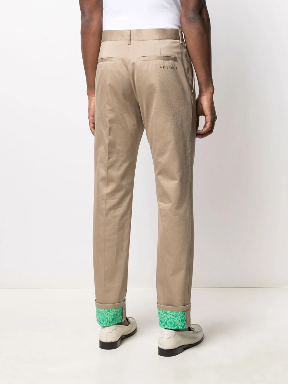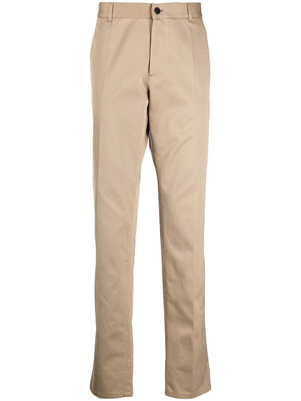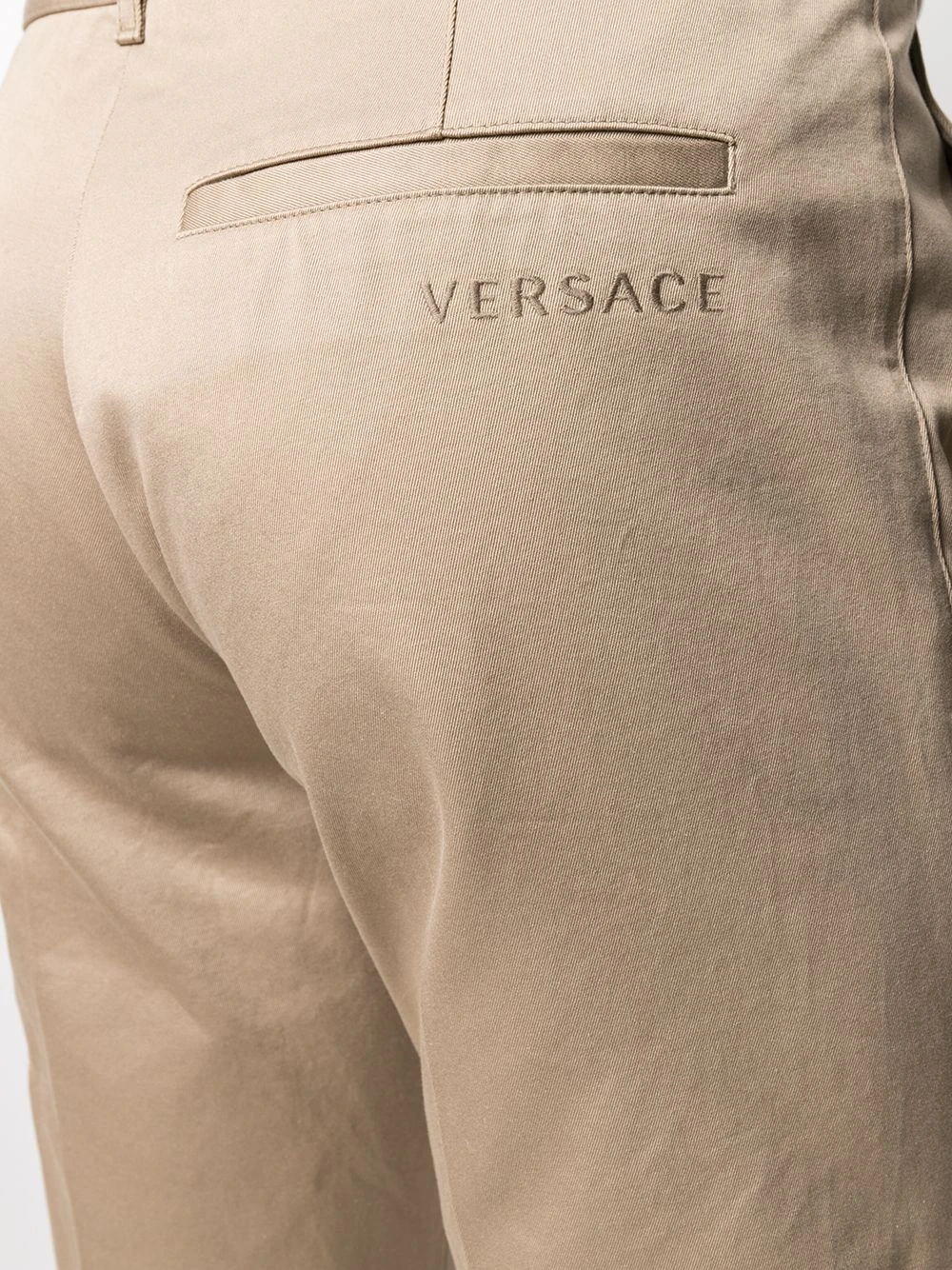 Fermeture boutonnée, passants de ceinture, deux poches latérales passepoilées, poches arrière passepoilées, logo brodé à l’arrière. Matière : coton.