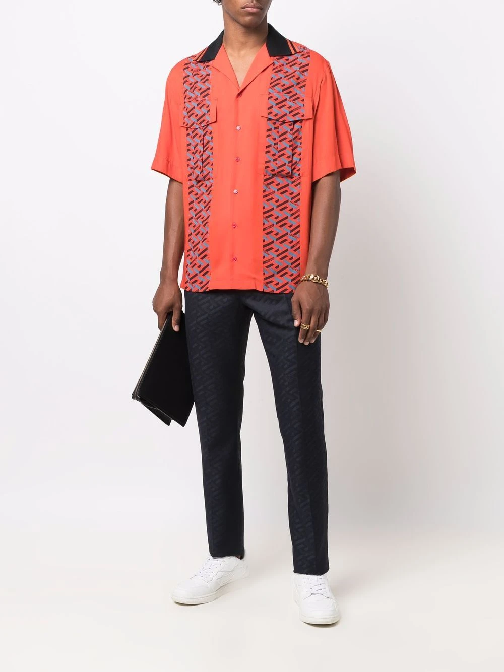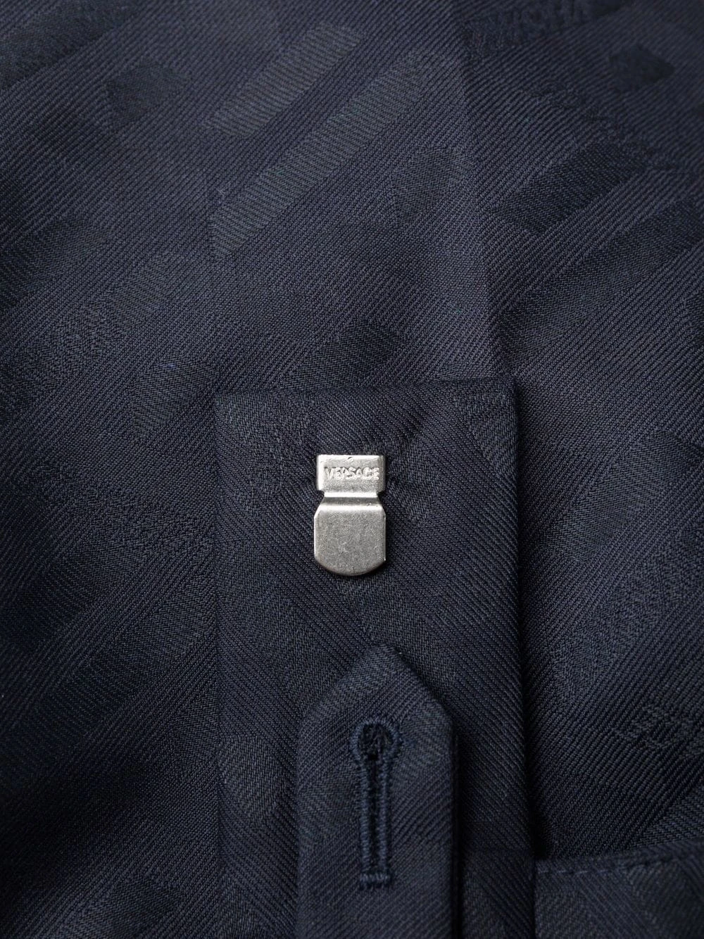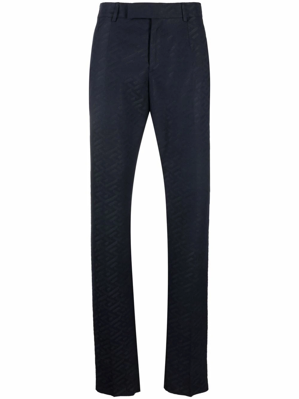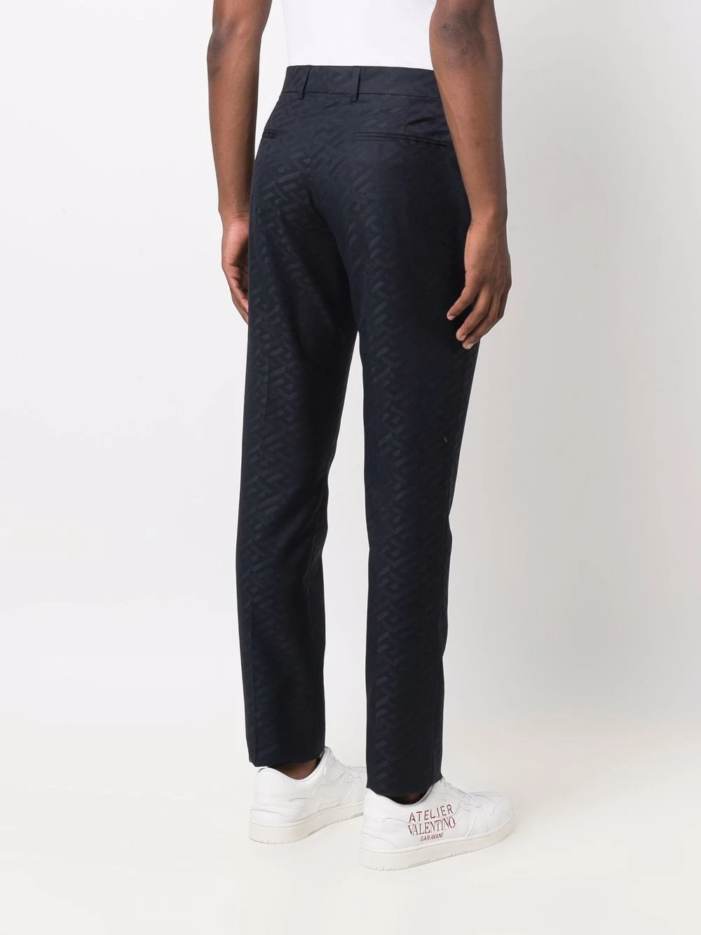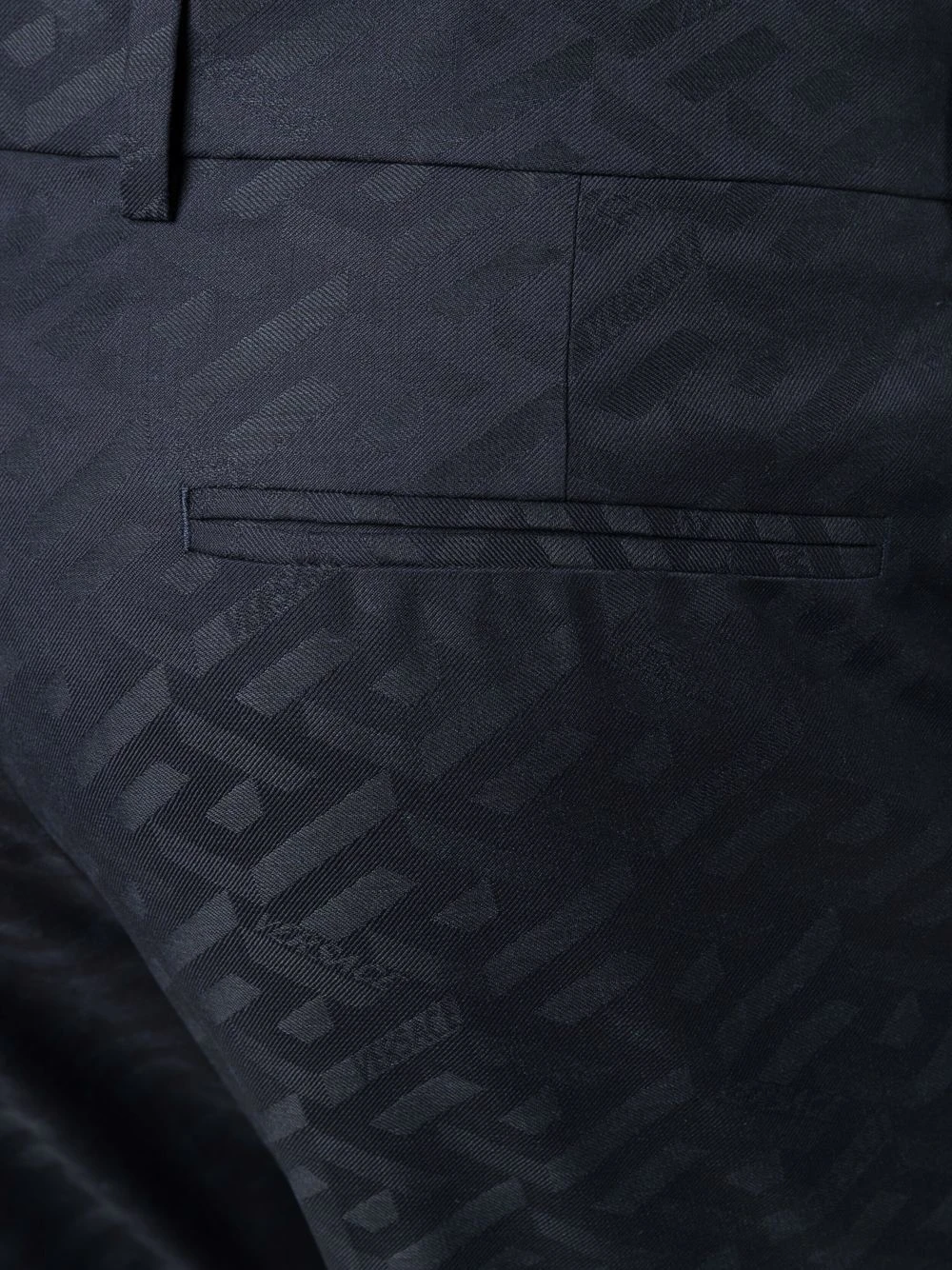 Motif monogrammé, passants de ceinture, fermeture à œillets et agrafes, poches latérales fendues, deux poches passepoilées à l’arrière, coupe droite.