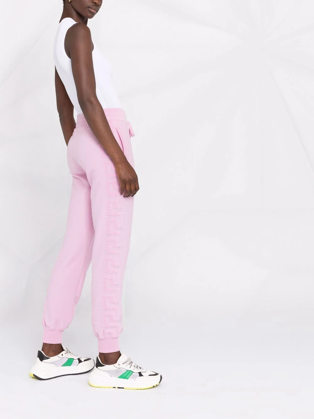 Détail Greca signature, taille élastique à lien de resserrage, deux poches latérales fendues, chevilles élastiques. Couleur : rose.