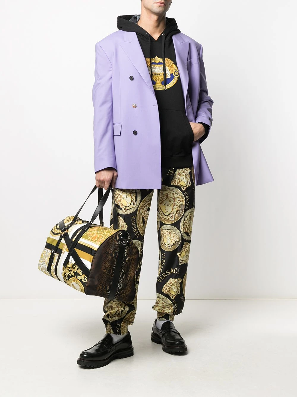 Ceinture élastique, poches plaquées latérales, imprimé graphique, poignets élastiqués. Matière : coton.