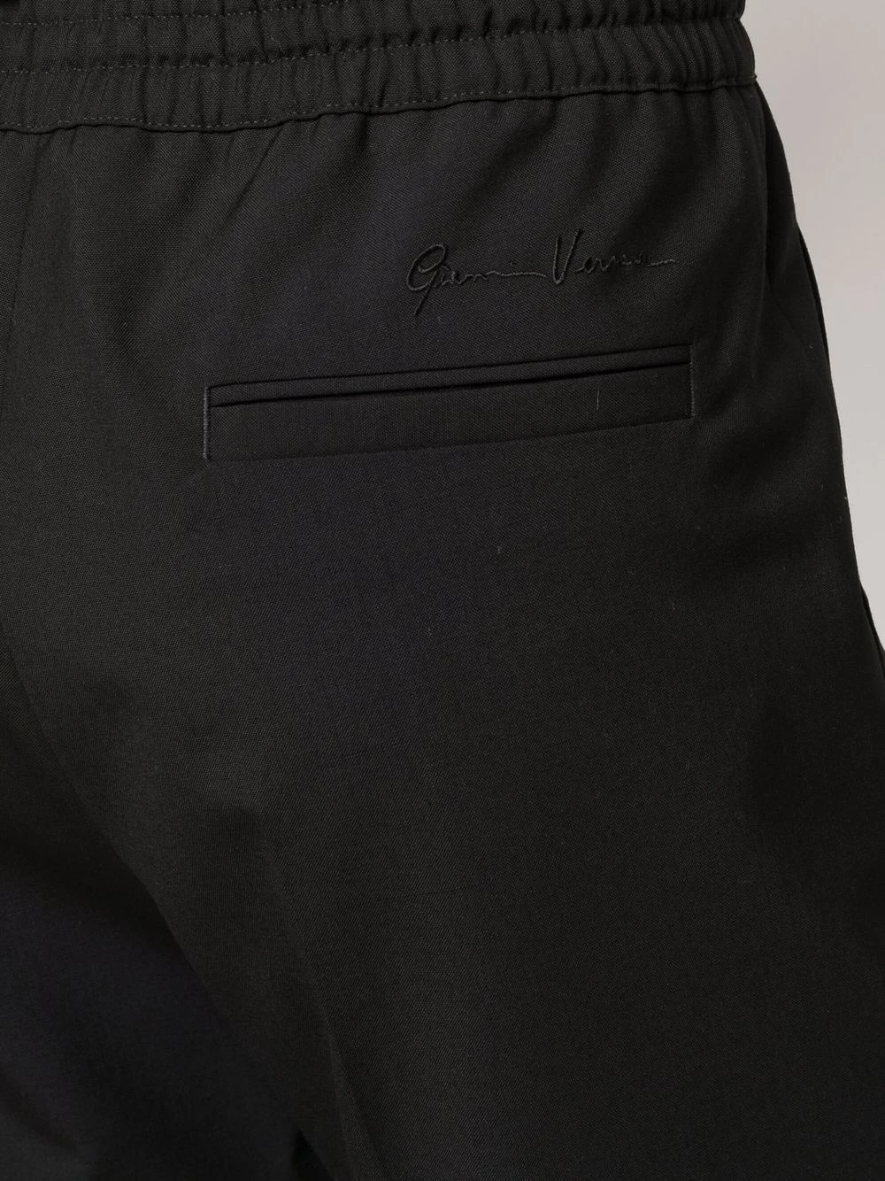 Logo brodé à l’arrière, taille élastique à lien de resserrage, deux poches latérales fendues, poche arrière passepoilée, coupe droite. Couleur : noir.