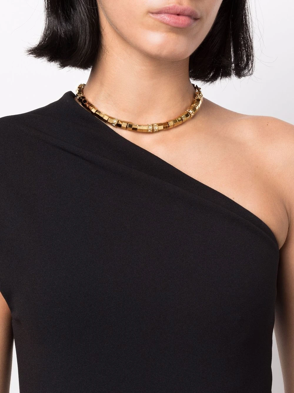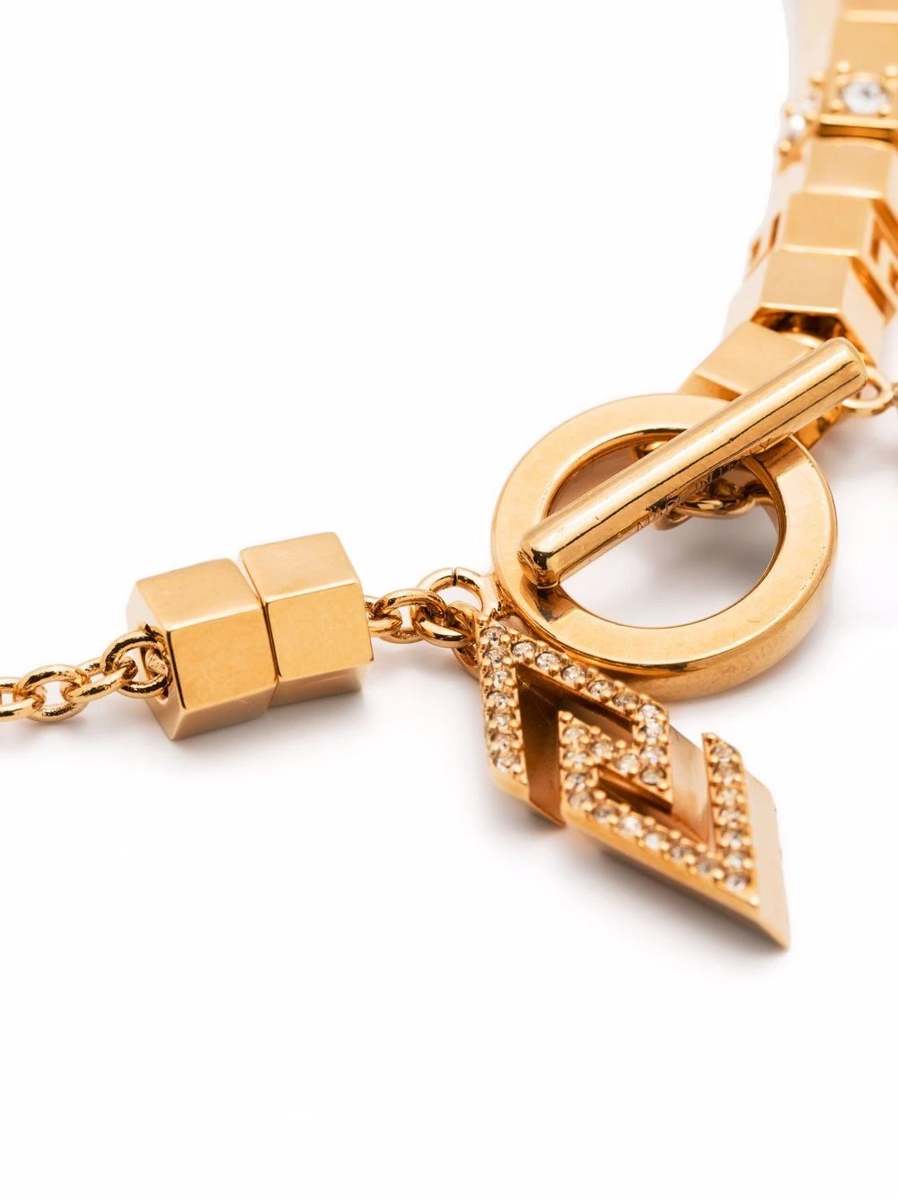 Détail Greca signature, motif Medusa, motif Medusa, logo doré, ornement en strass, fermoir en T. Matière : métal.