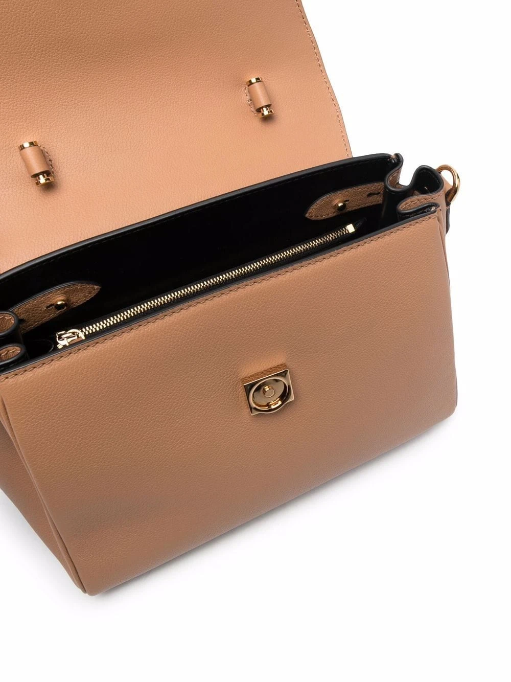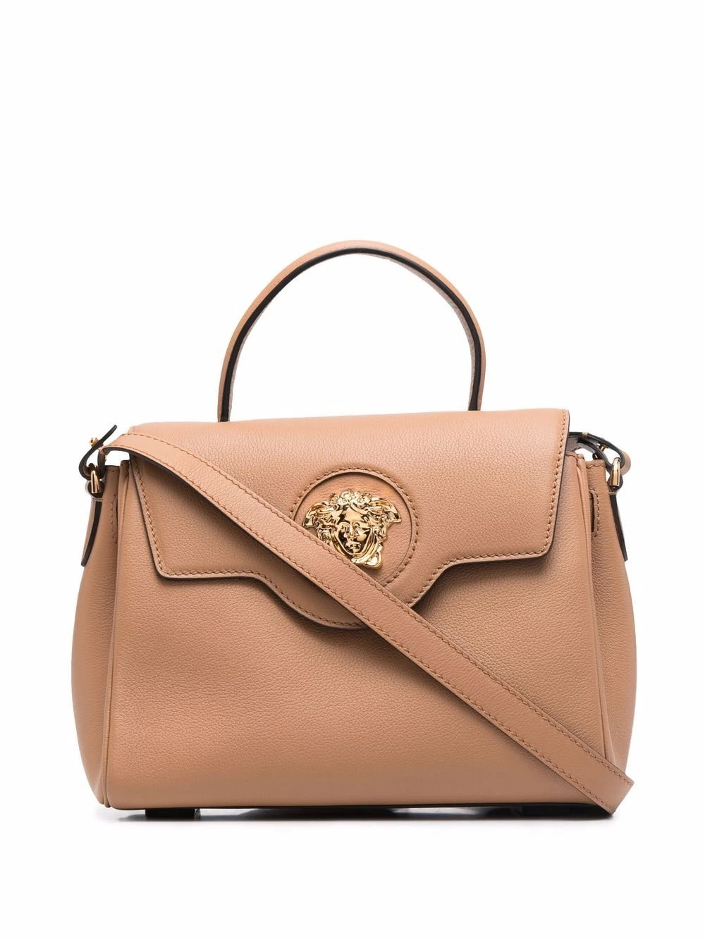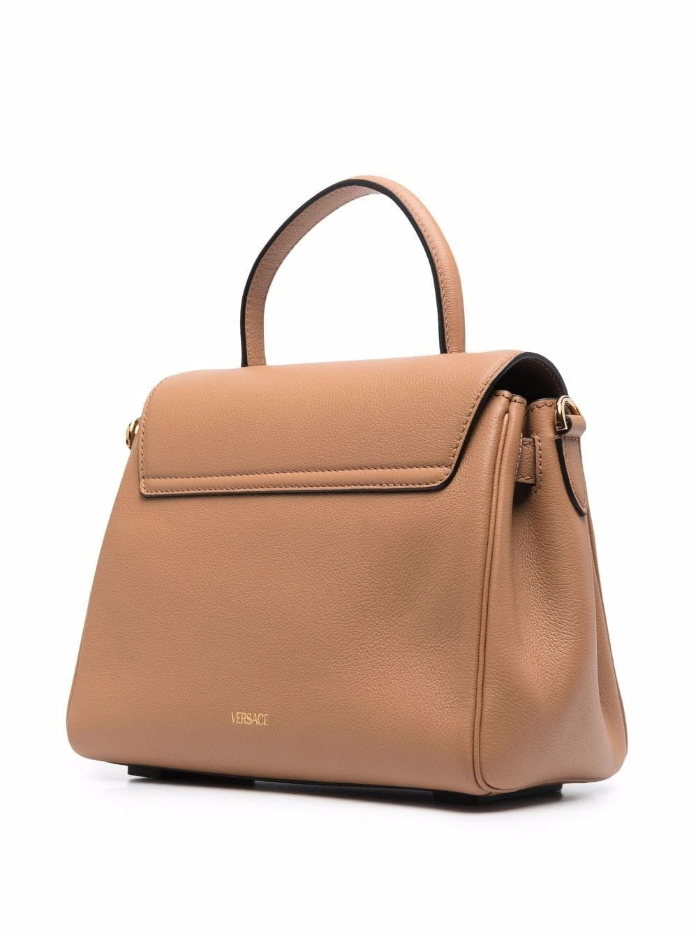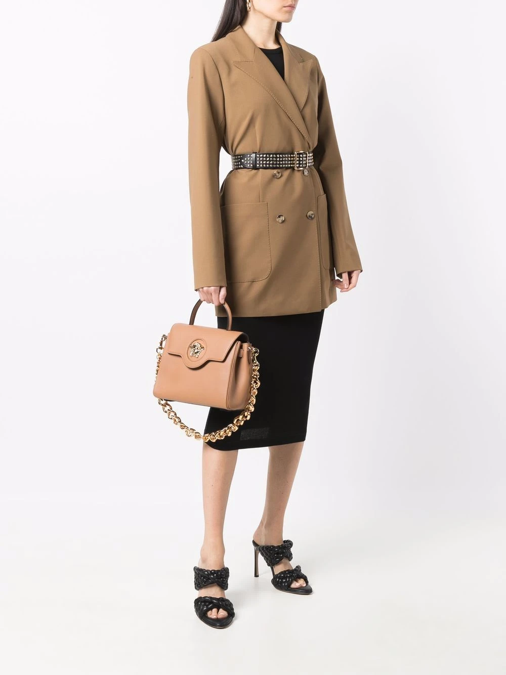 Détail Medusa, anse classique, bride porté épaule en chaîne, rabat sur le dessus à fermeture magnétique, poches intérieures zippées, pieds en métal. Couleur : marron. Matière : cuir.