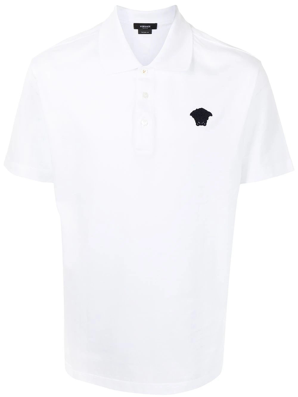 Motif Medusa, col polo, patte de boutonnage sur le devant, manches courtes, ourlet droit. Couleur : blanc. Matière : coton.