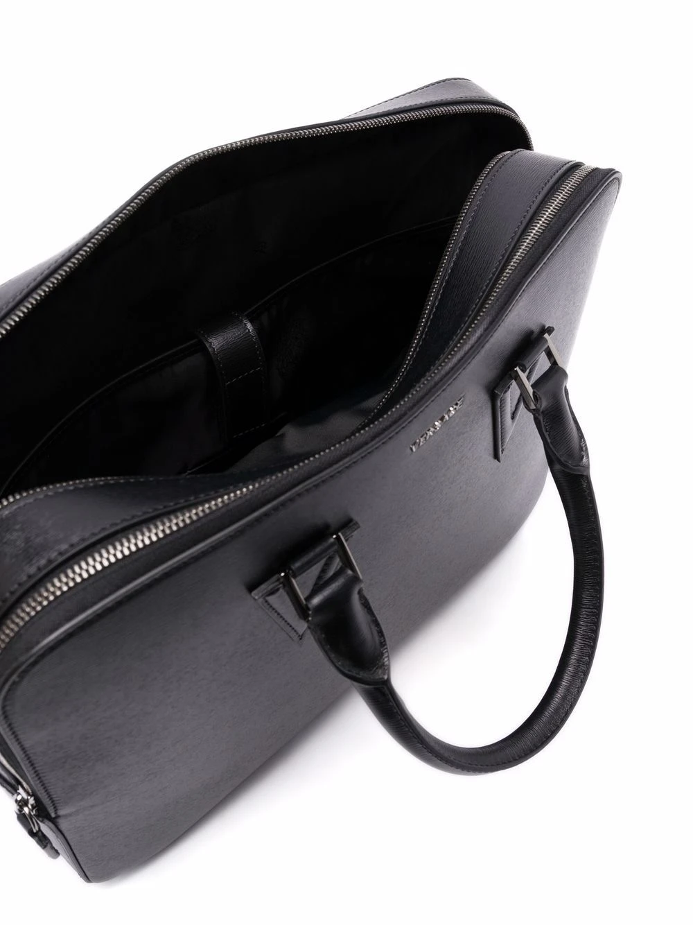 Anses sur le dessus, bride porté épaule détachable, compartiment principal, poche intérieure plaquée, fermeture zippée sur le dessus. Couleur : noir. Matière : cuir.