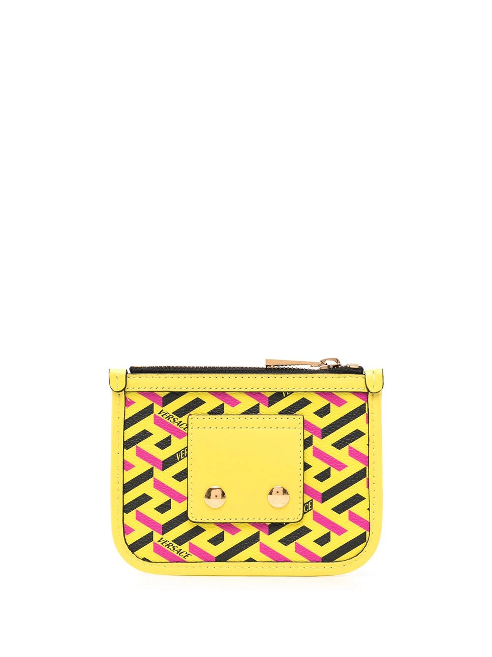 Imprimé La Greca signature, finitions en métal doré, logo lettre, fermeture zippée sur le dessus, compartiment unique pour carte, patch logo intérieur. Matière : cuir.