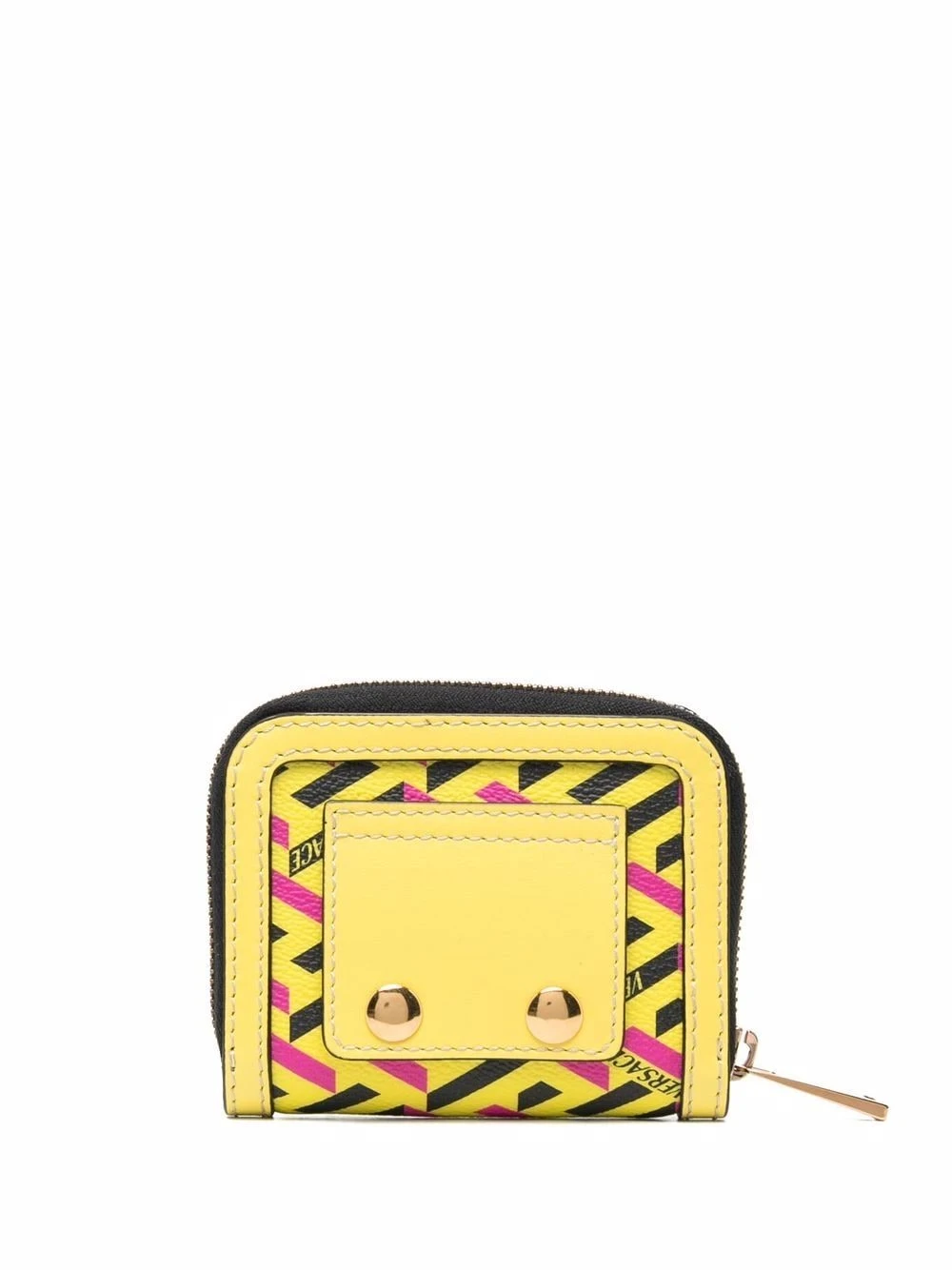 Motif Greca signature imprimé, fermeture zippée tout autour, plusieurs poches intérieures plaquées. Couleur : jaune. Matière : cuir.