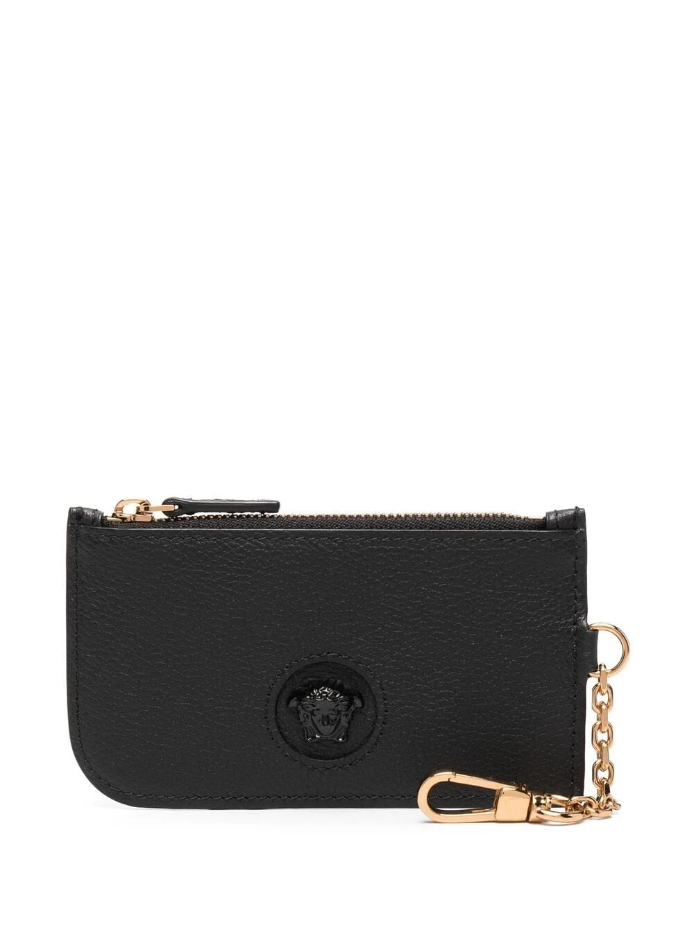 Texture grainée, motif Medusa, finitions en métal doré, détails de chaînes, fermeture zippée sur le dessus, fermoir mousqueton.