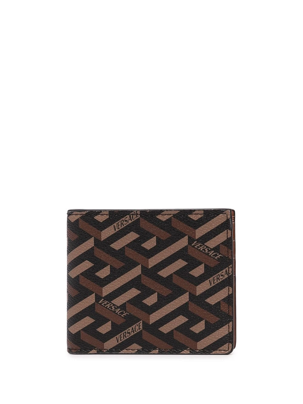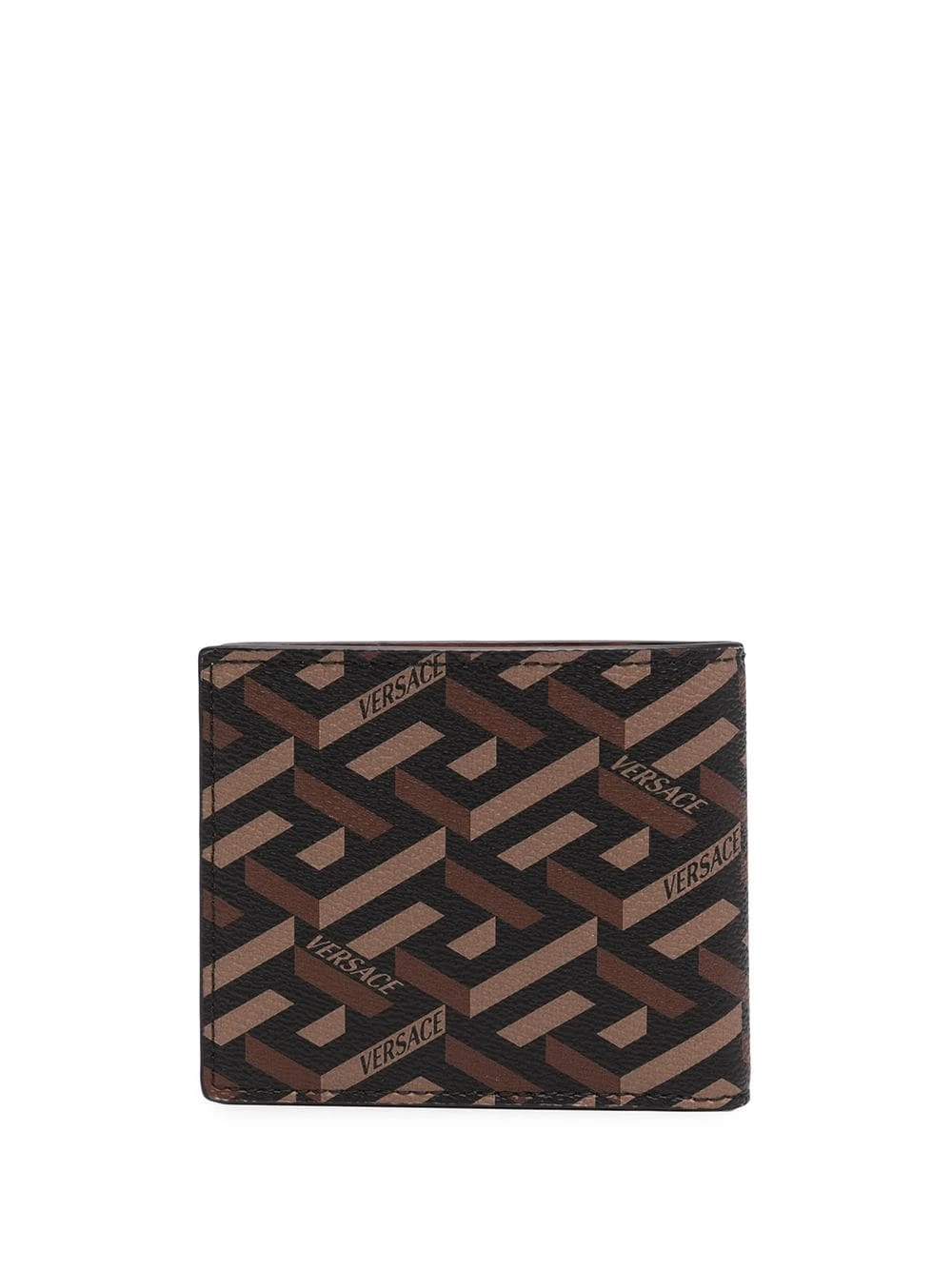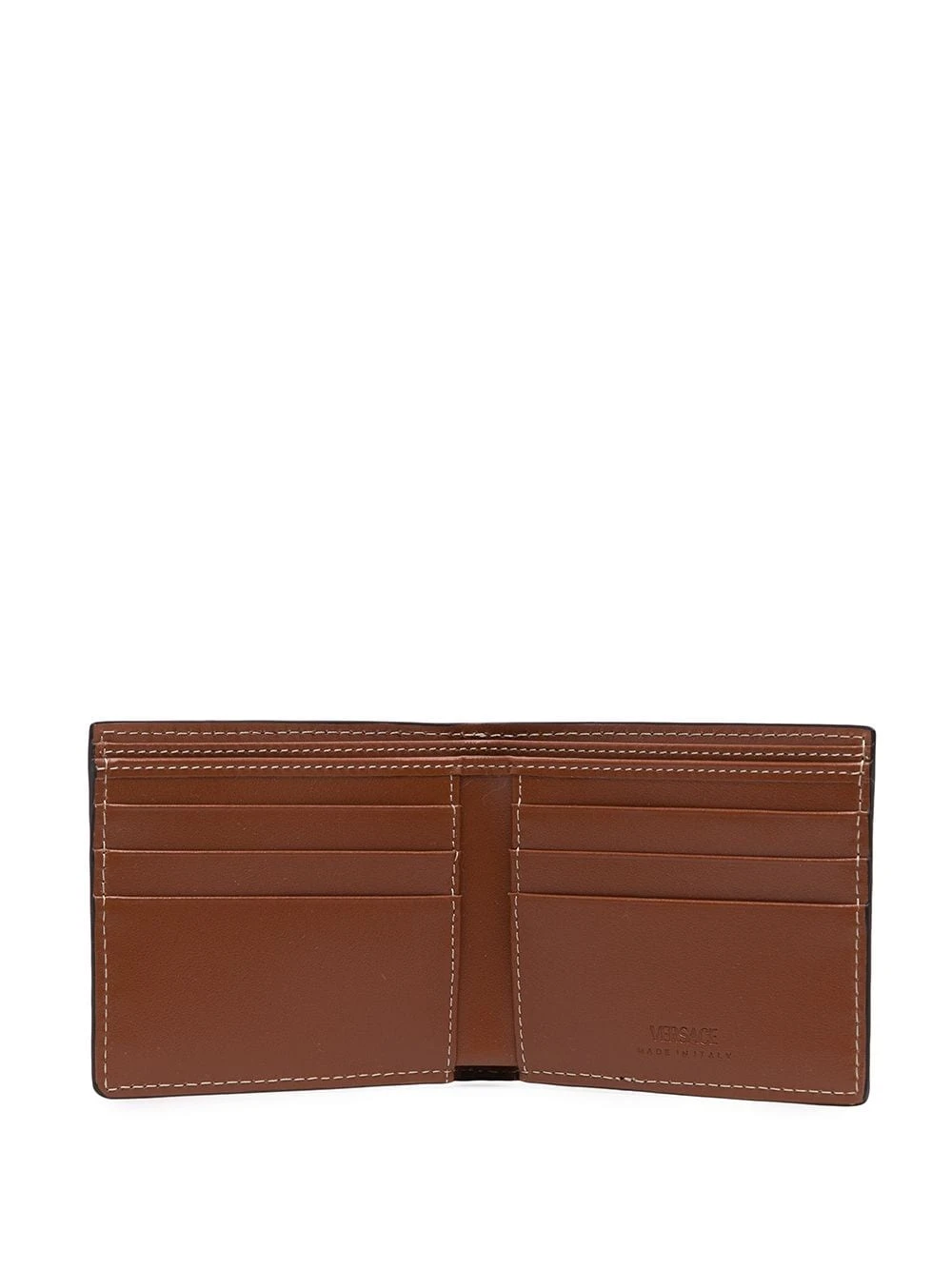 Détail Greca signature, design pliant, coutures ton sur ton, compartiment à billets, compartiments intérieurs pour carte, logo imprimé à l’intérieur. Matière : cuir.