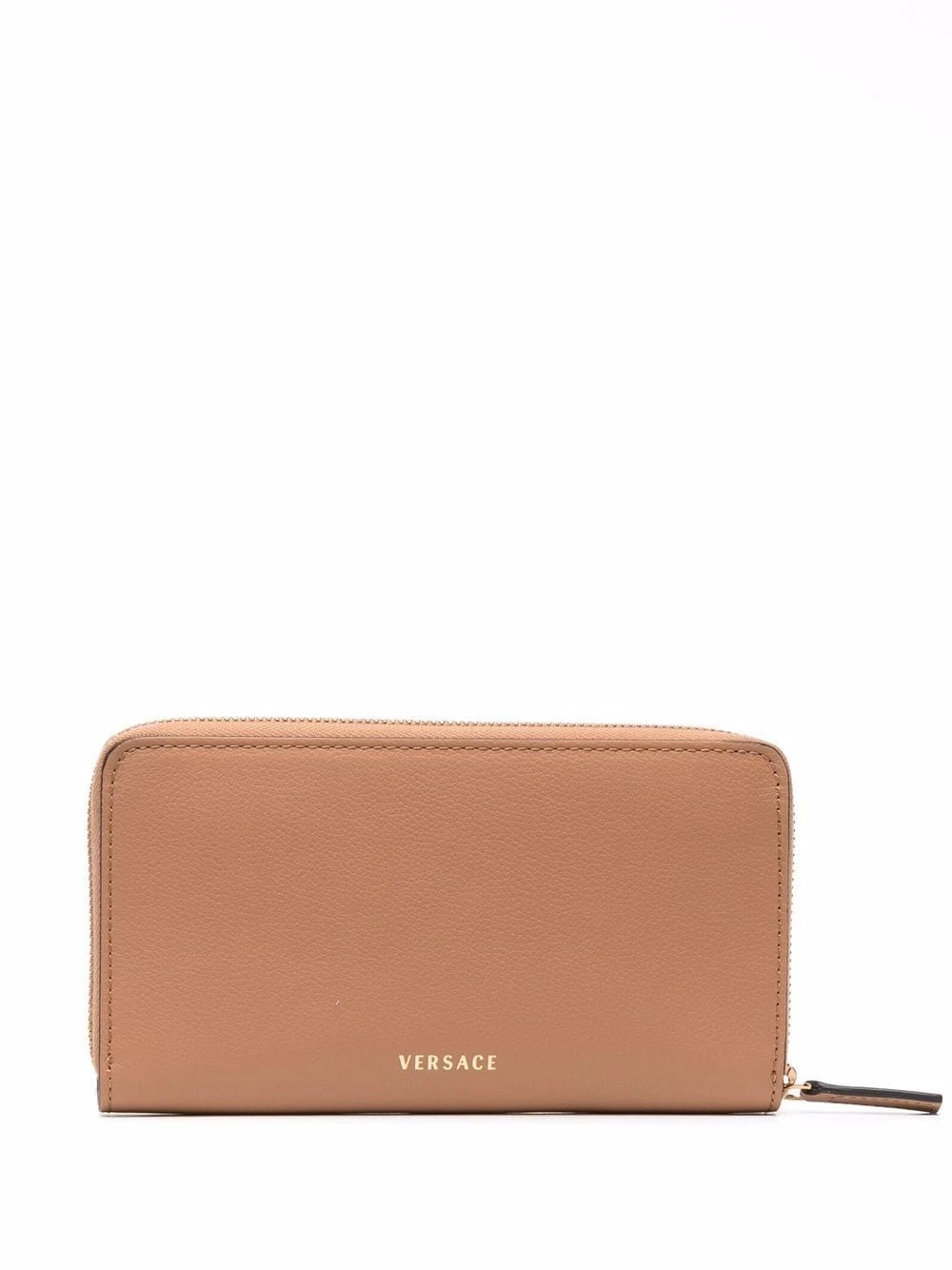Motif Medusa, fermeture zippée tout autour, compartiments intérieurs pour carte, poche ticket. Couleur : marron. Matière : cuir de veau.
