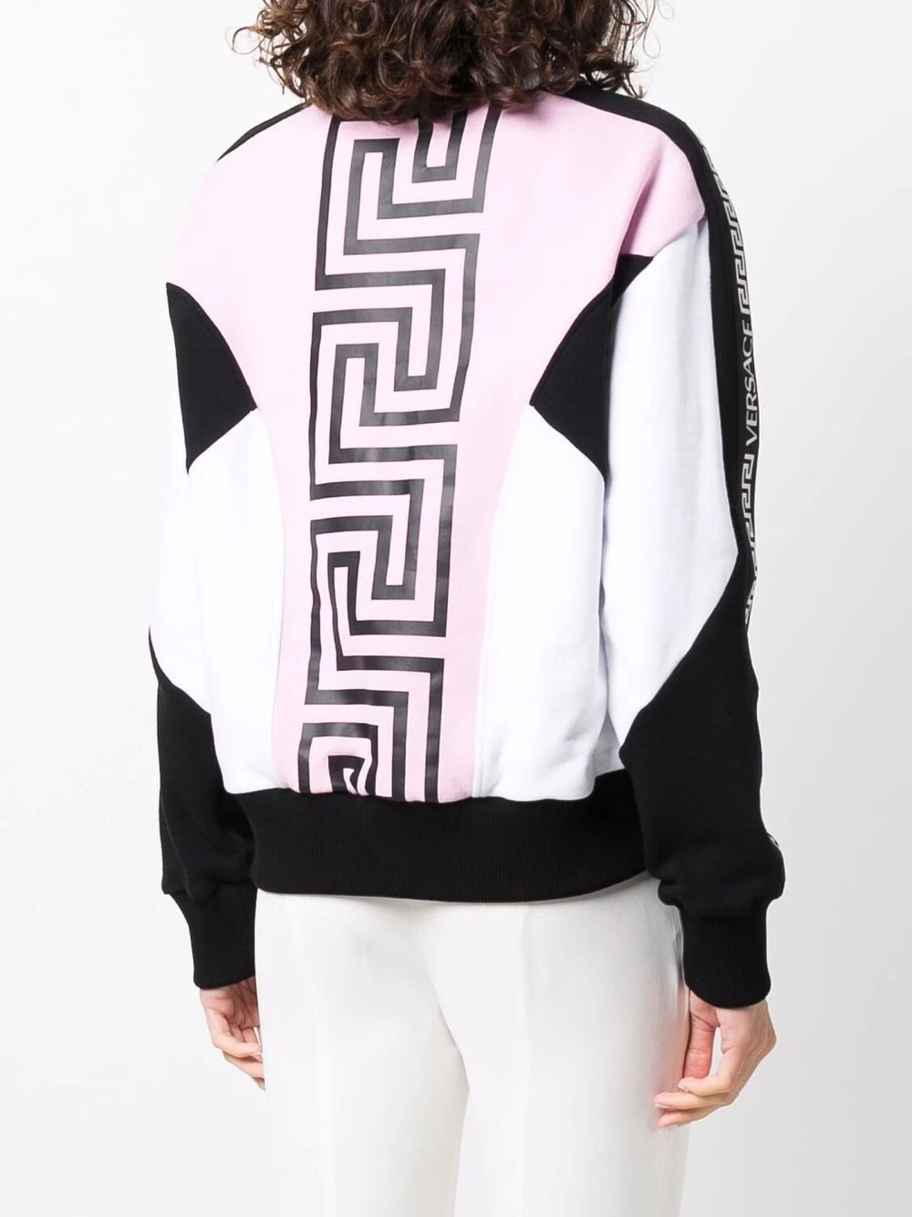 Design à empiècements, motif Greca signature imprimé, encolure ronde, manches longues, logo imprimé sur le devant, finition à bande logo, bord en maille côtelée.