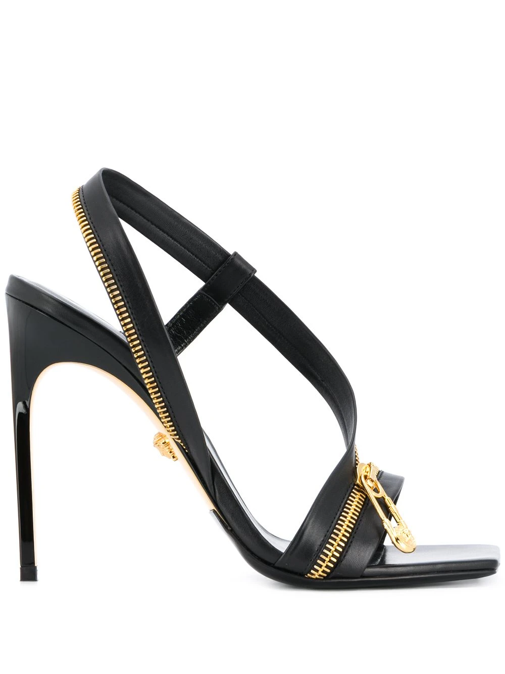 Bout carré, bout ouvert, détails zippés, design à enfiler, bride arrière, semelle intérieure à logo, talon haut, détail d’épingle Medusa signature. Matière : cuir.
