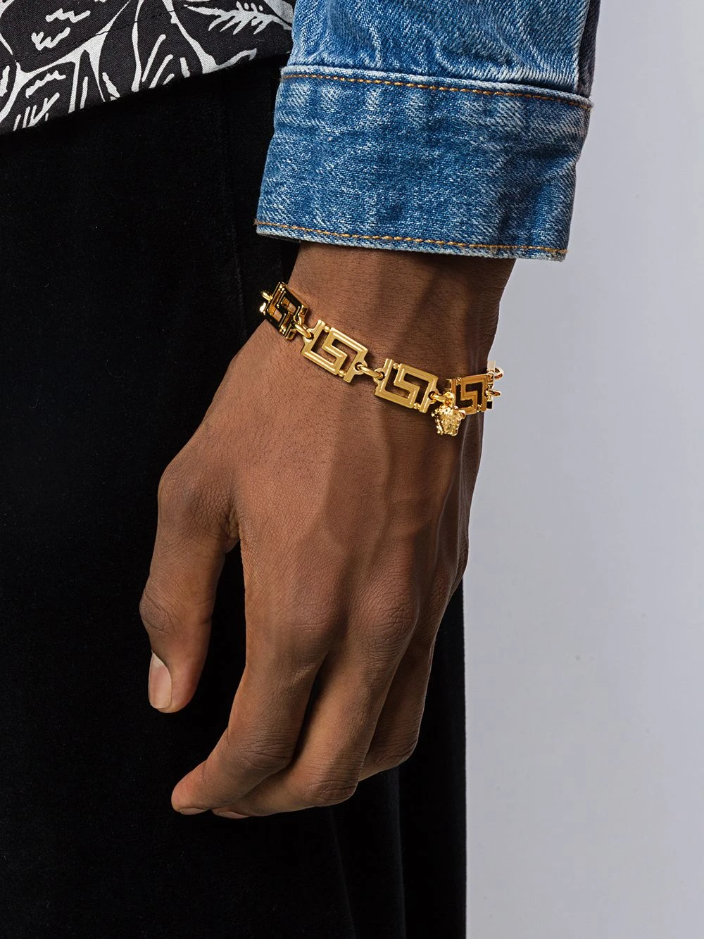Gourmette Greca en métal Versace avec fermoir mousqueton et breloque à logo.