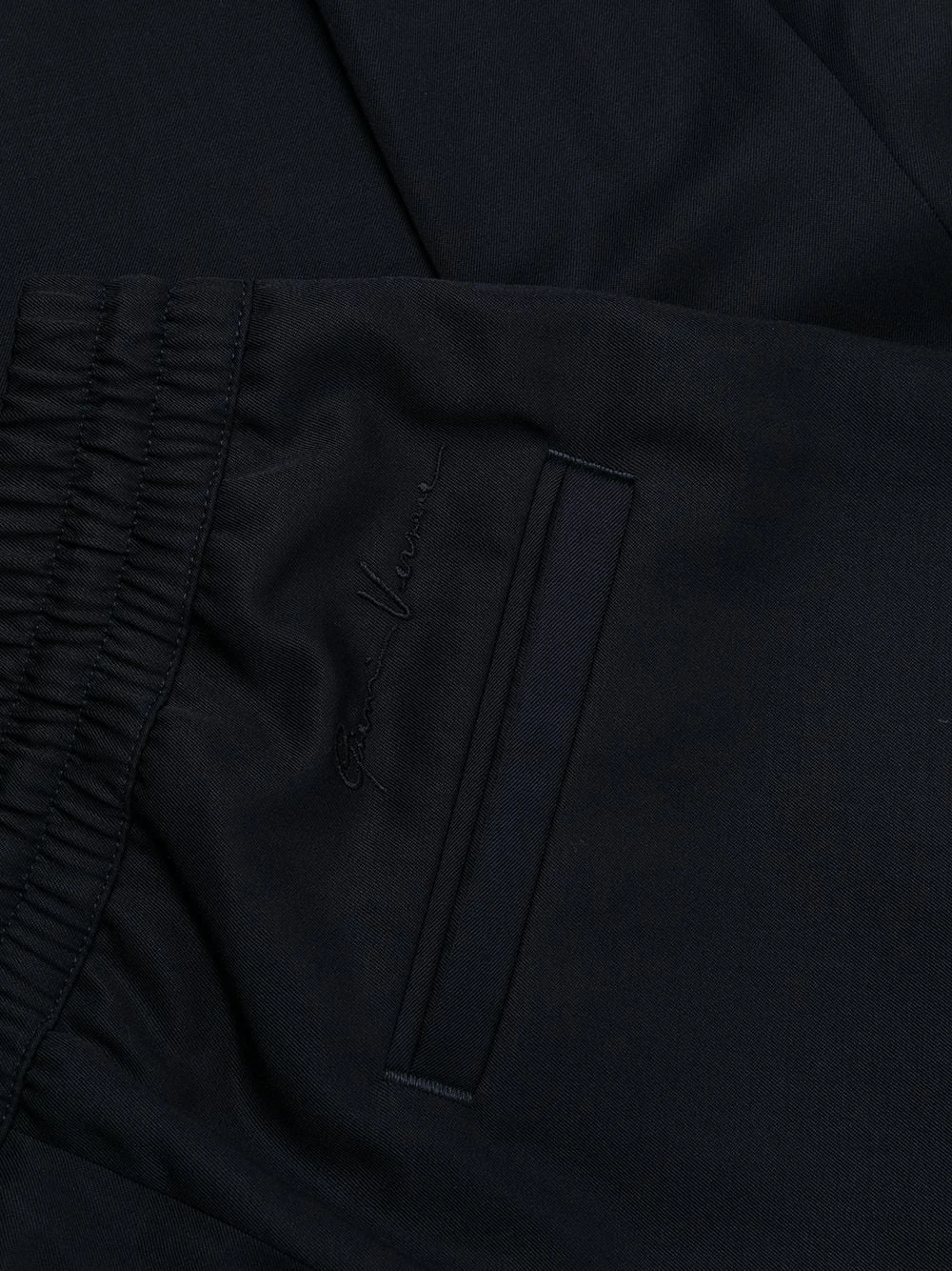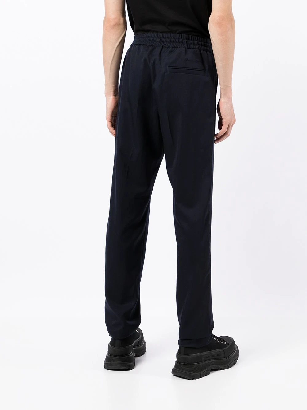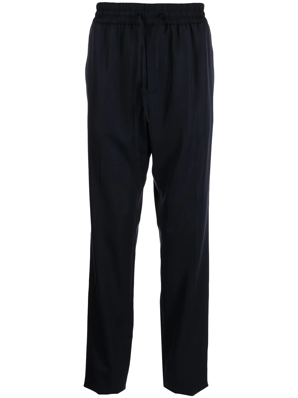 Ceinture élastique, deux poches latérales fendues, poche arrière passepoilée, coupe droite. Couleur : bleu.