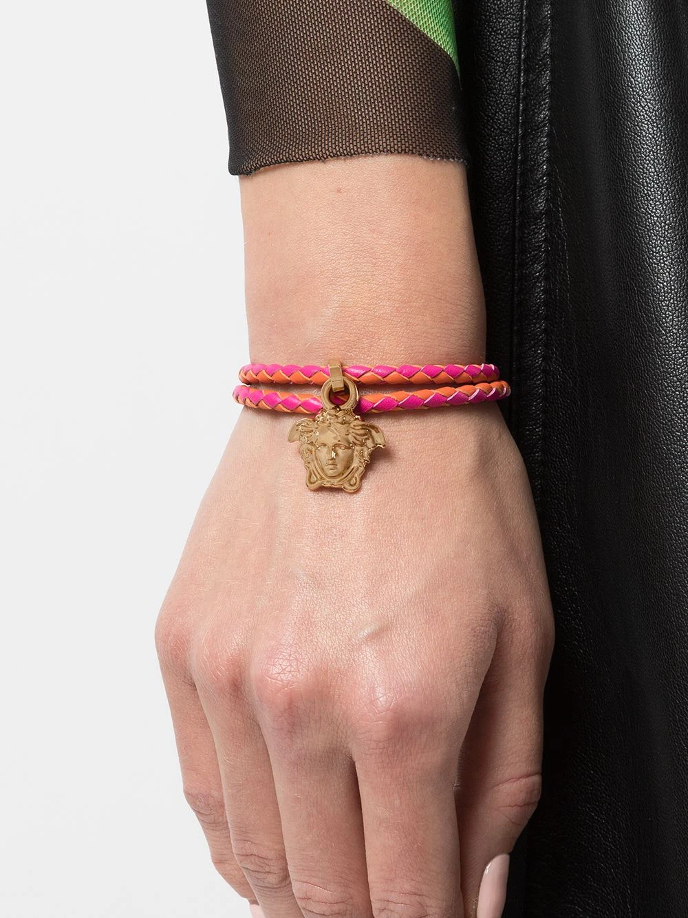 Design tissé, modèle bicolore, motif Medusa, finitions en métal doré, lien de resserrage. Matière : cuir.