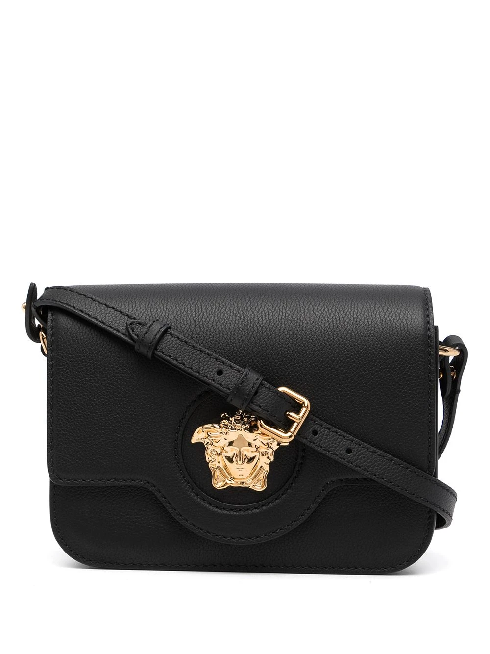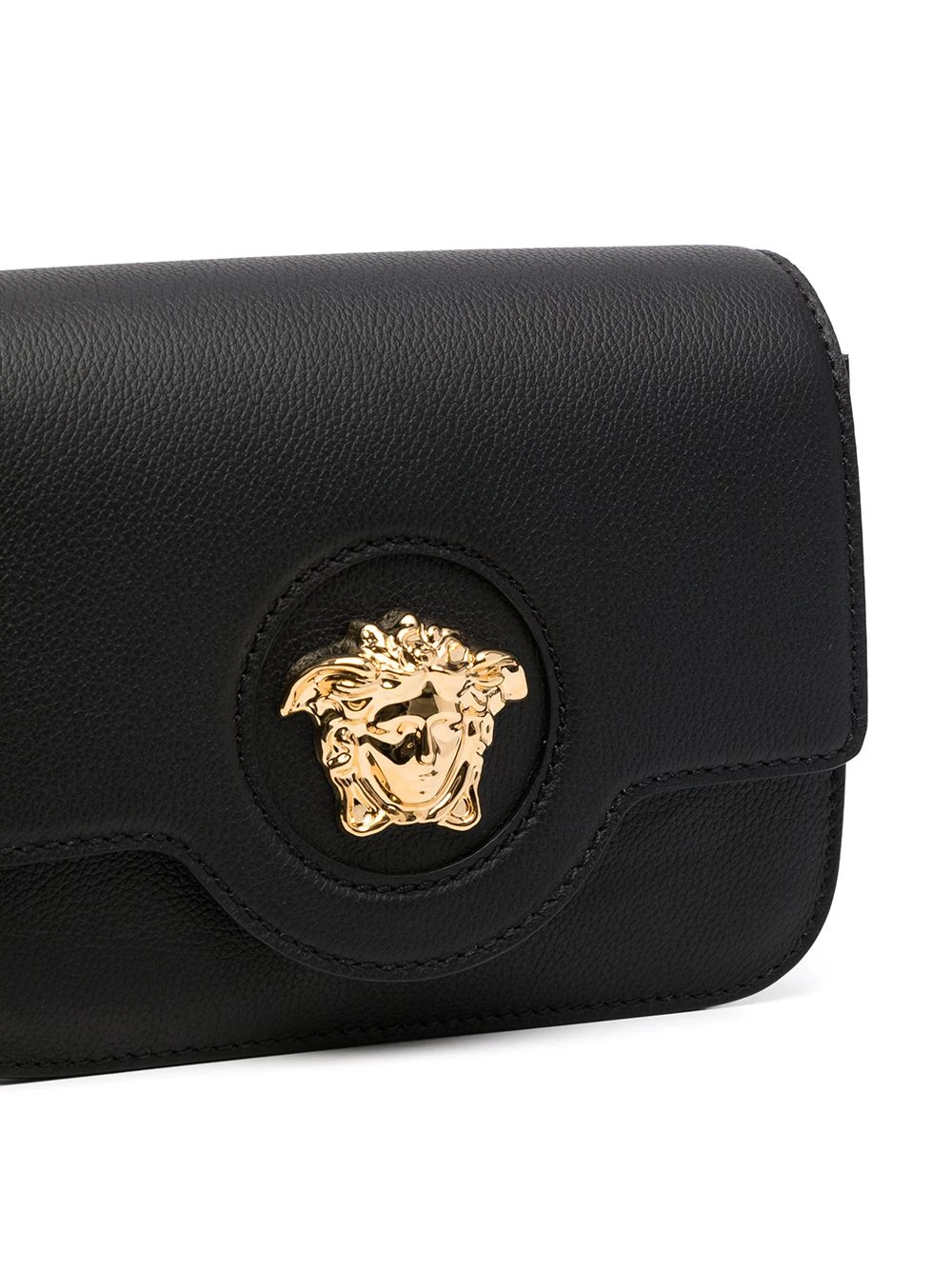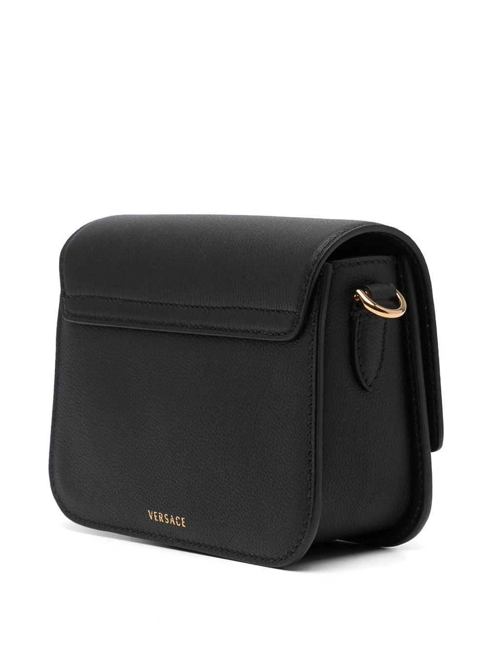 Coutures ton sur ton, détail Medusa, finitions en métal doré, rabat sur le dessus à fermeture magnétique, bride porté épaule détachable et ajustable, compartiment principal, poche intérieure plaquée. Couleur : noir. Matière : cuir.