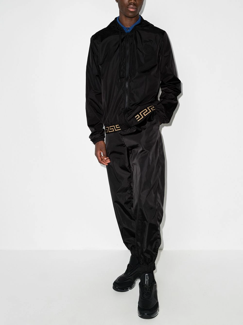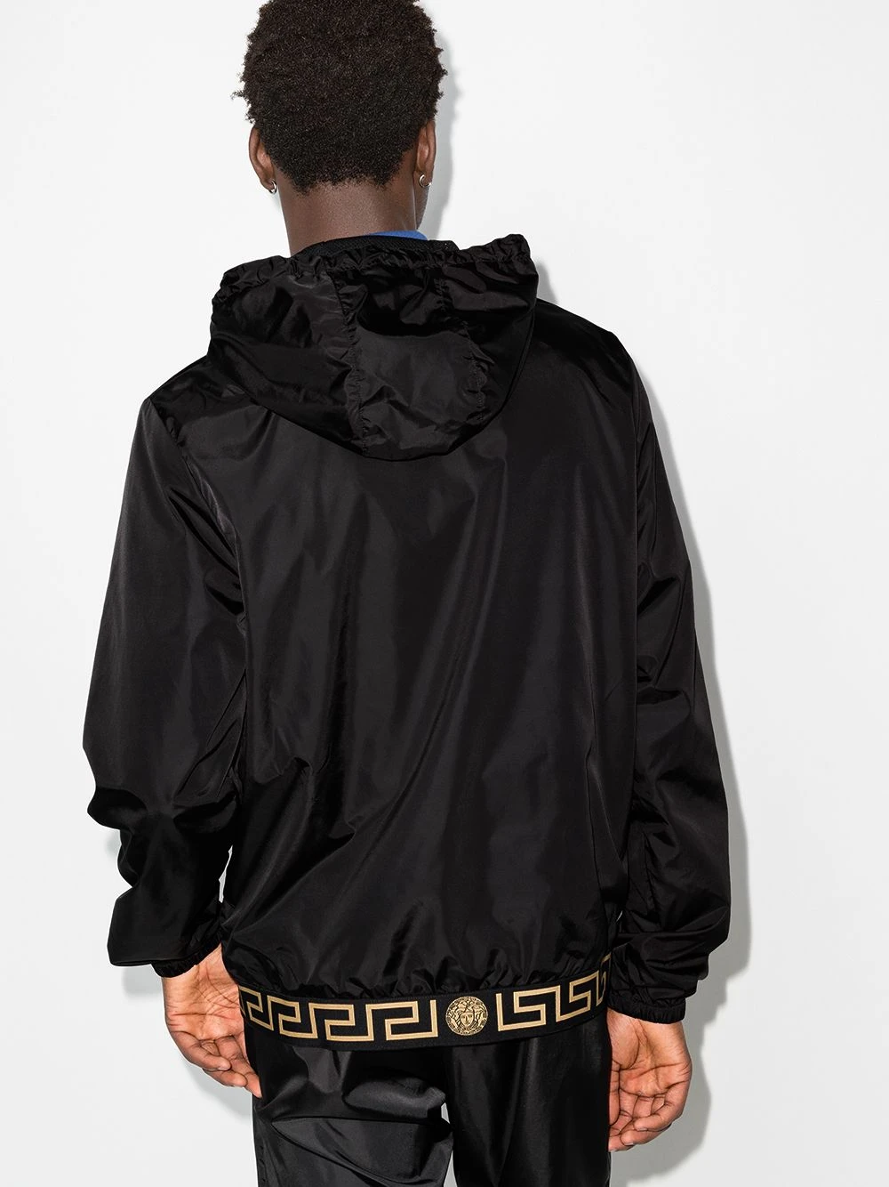 Noir, structure légère, détail Greca signature, patch poitrine à logo, capuche à lien de resserrage, fermeture zippée devant, manches longues, ourlet élastiqué.