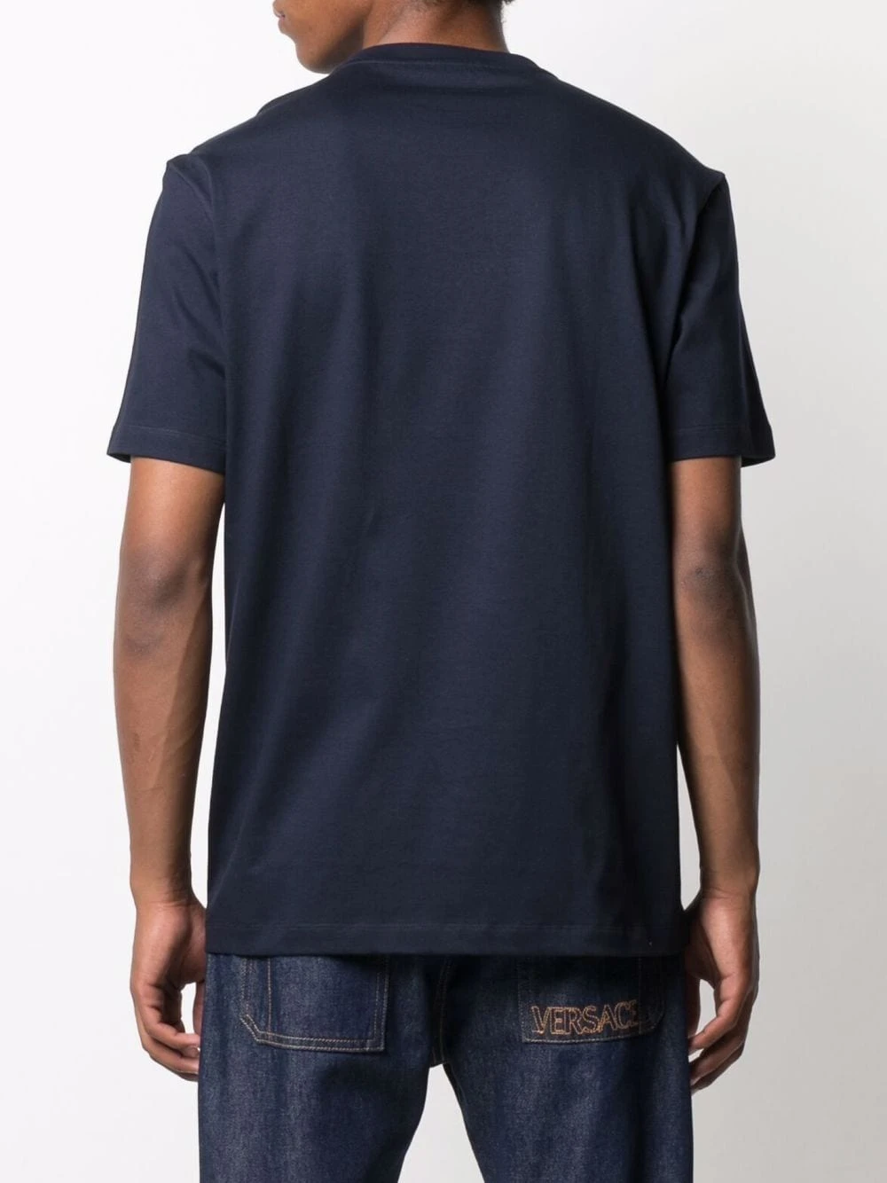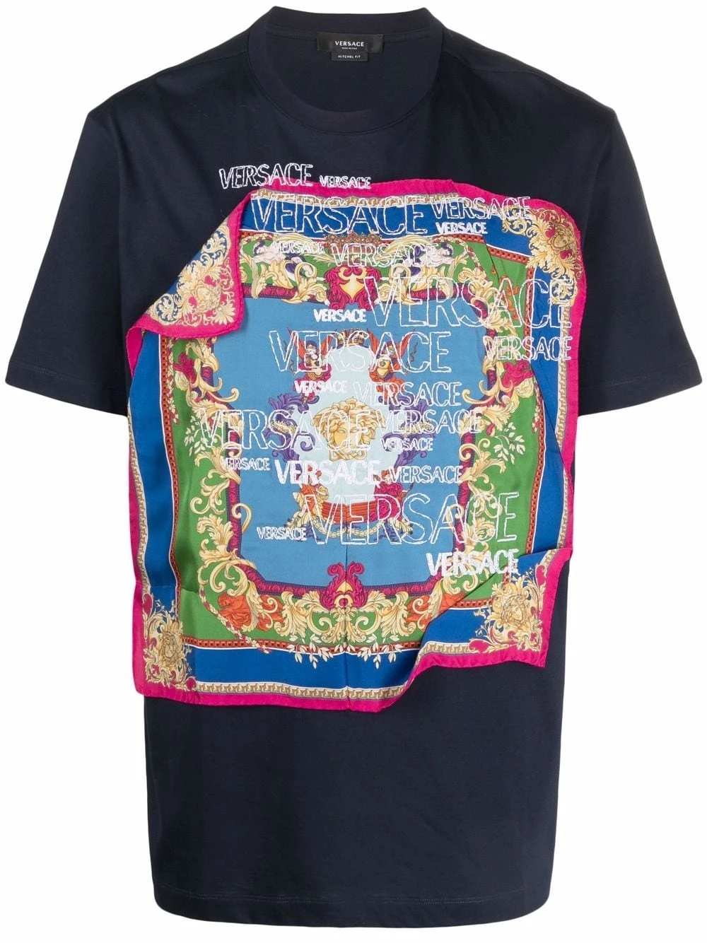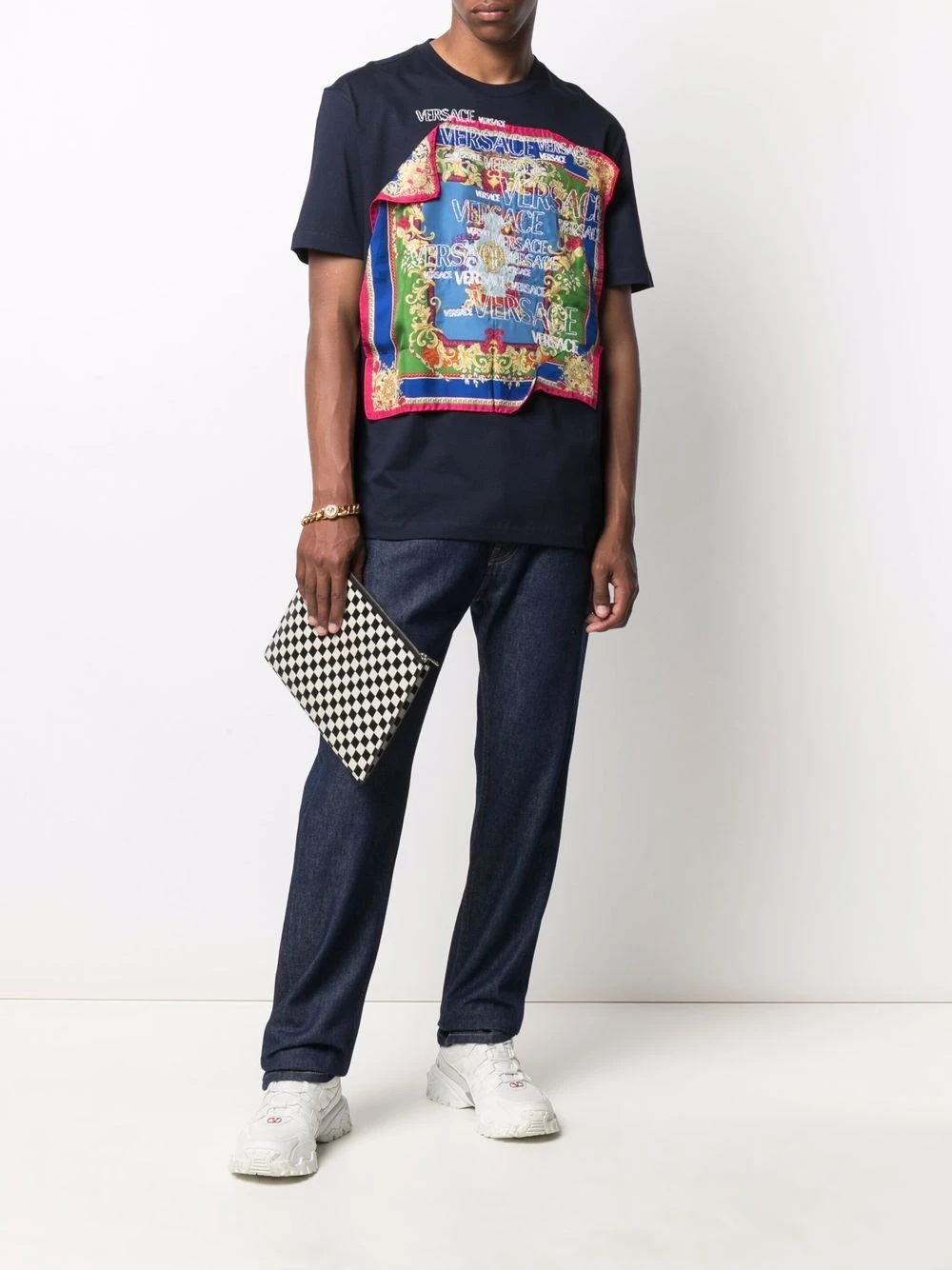 Détail de foulard, imprimé Barocco signature, patch poitrine à logo, encolure ronde, manches courtes.