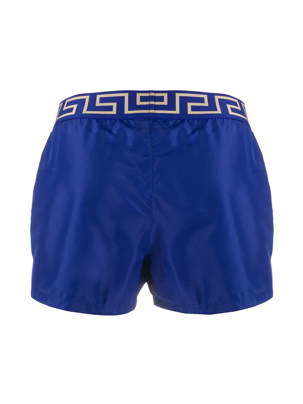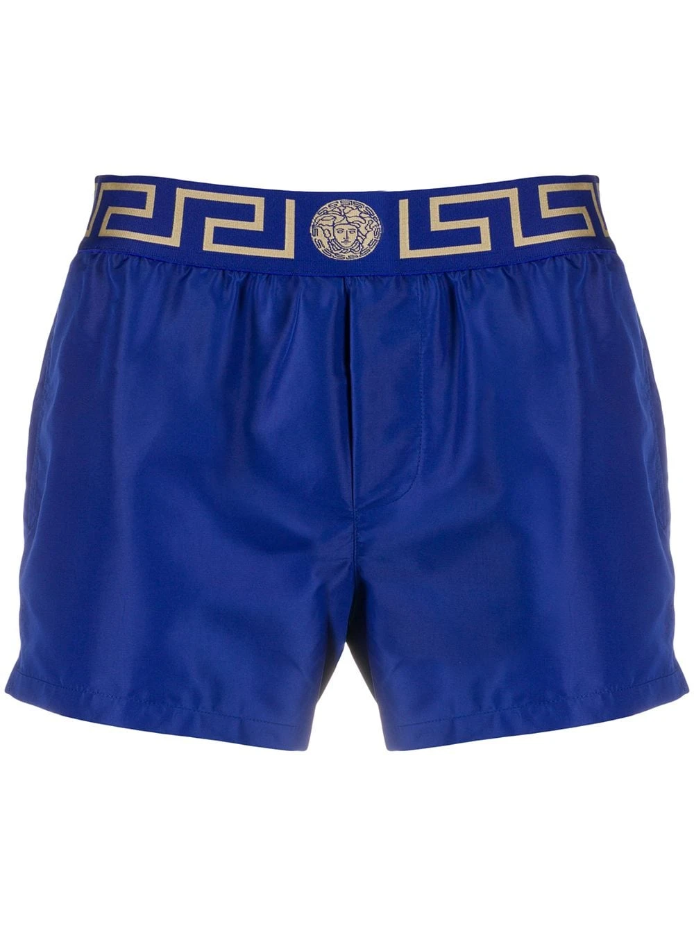 Détail Greca signature, motif Medusa, ceinture élastique. Couleur : bleu. Veillez à essayer les maillot de bain par-dessus vos propres sous-vêtements..