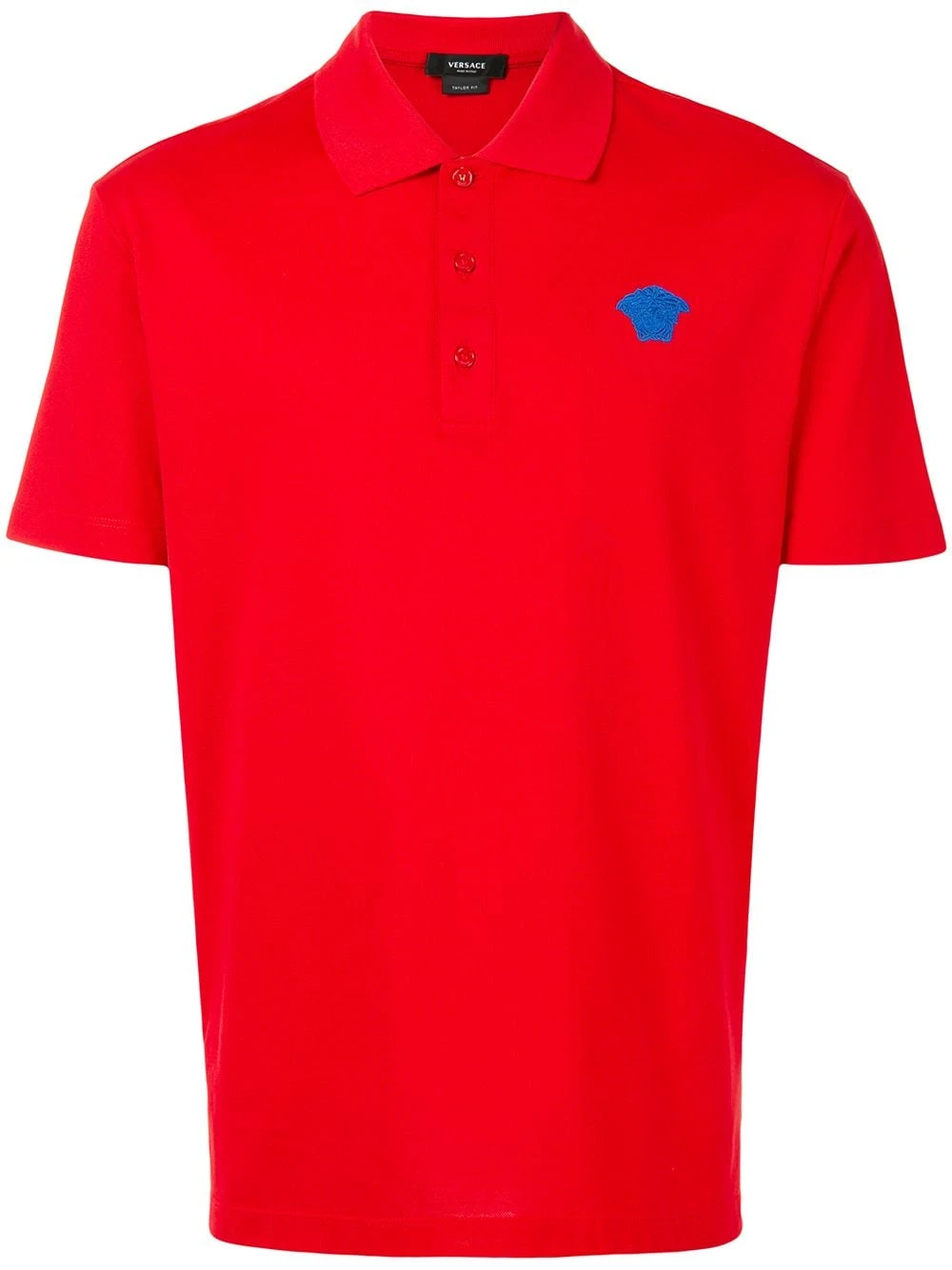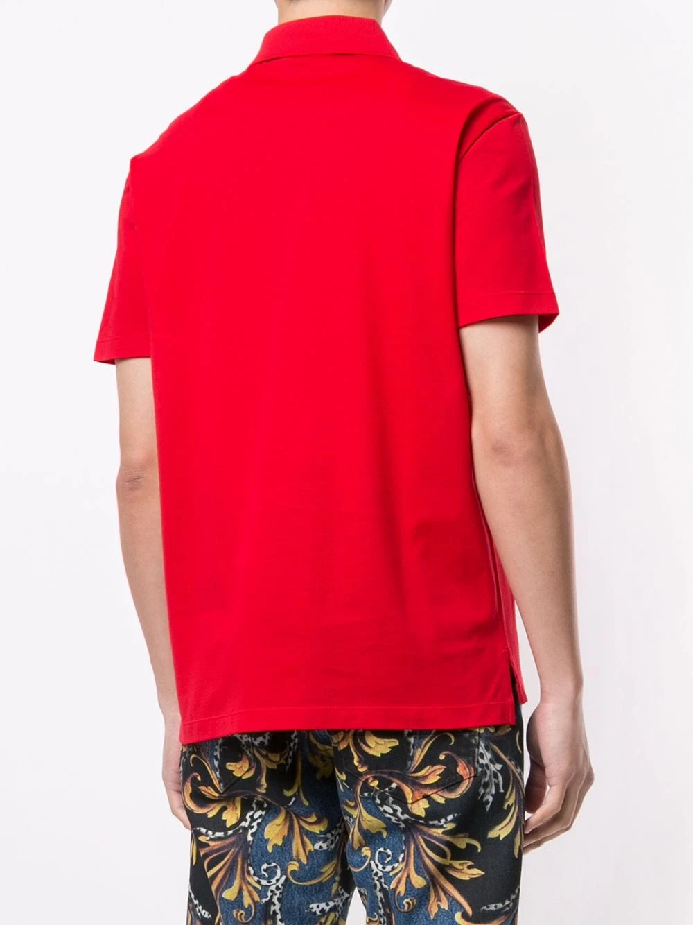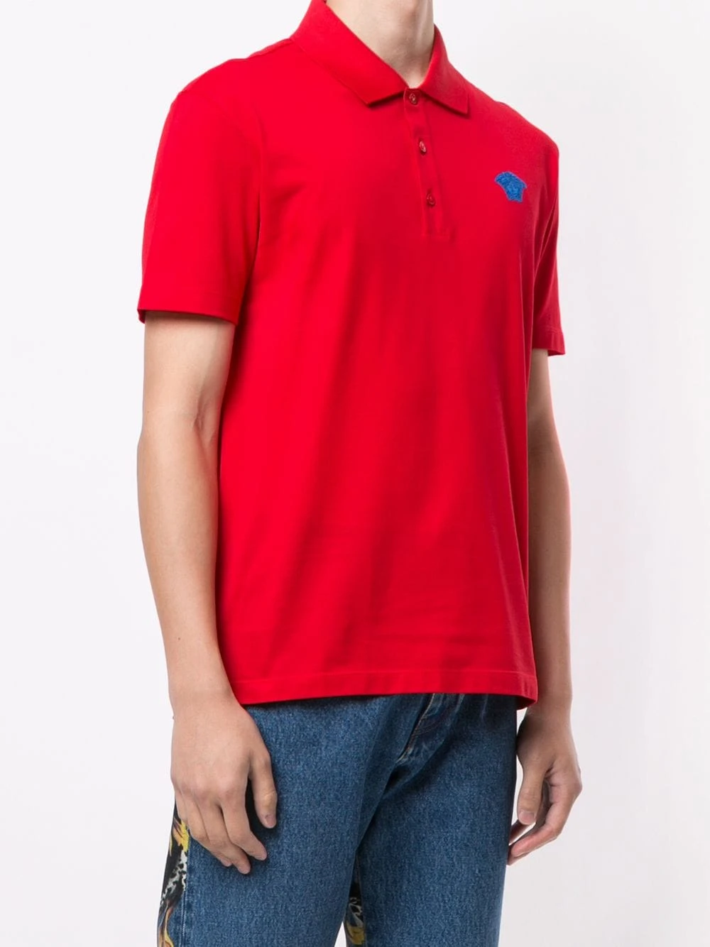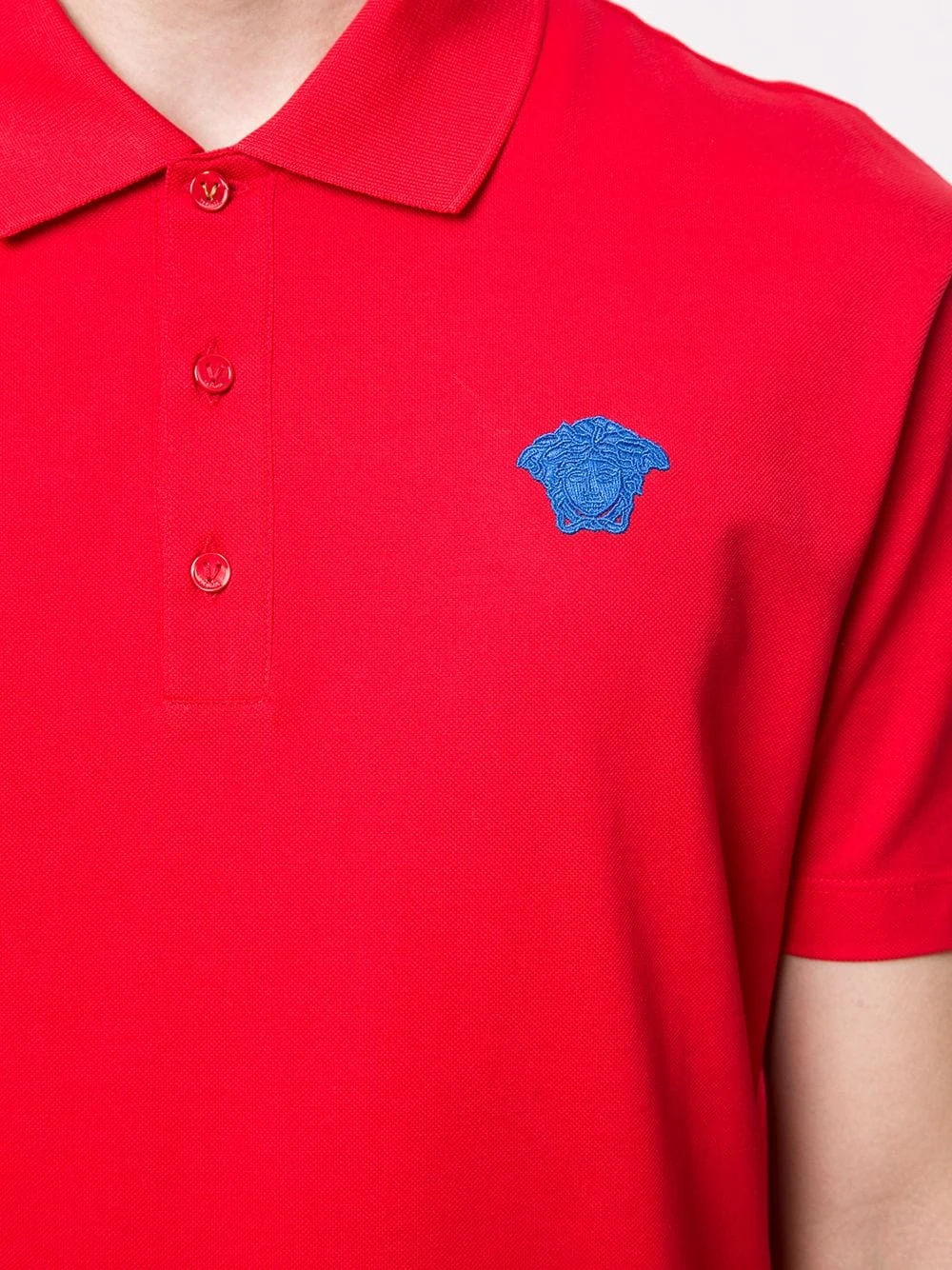 Motif Medusa, col italien, patte de boutonnage sur le devant, manches courtes. Couleur : rouge. Matière : coton.